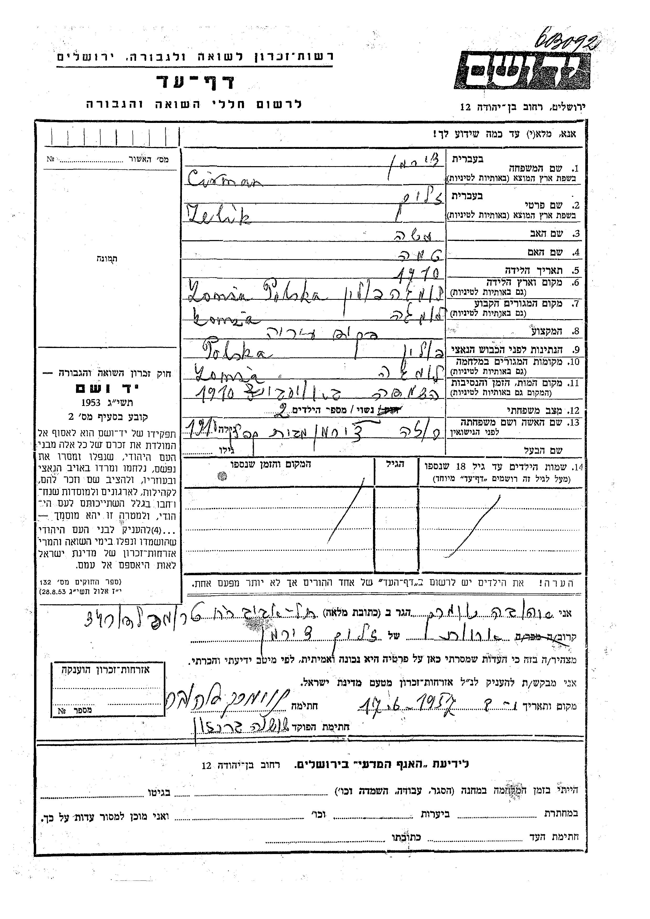 Cirman Zelig 1910 Łomża, Polonia Hoja de Testimonio