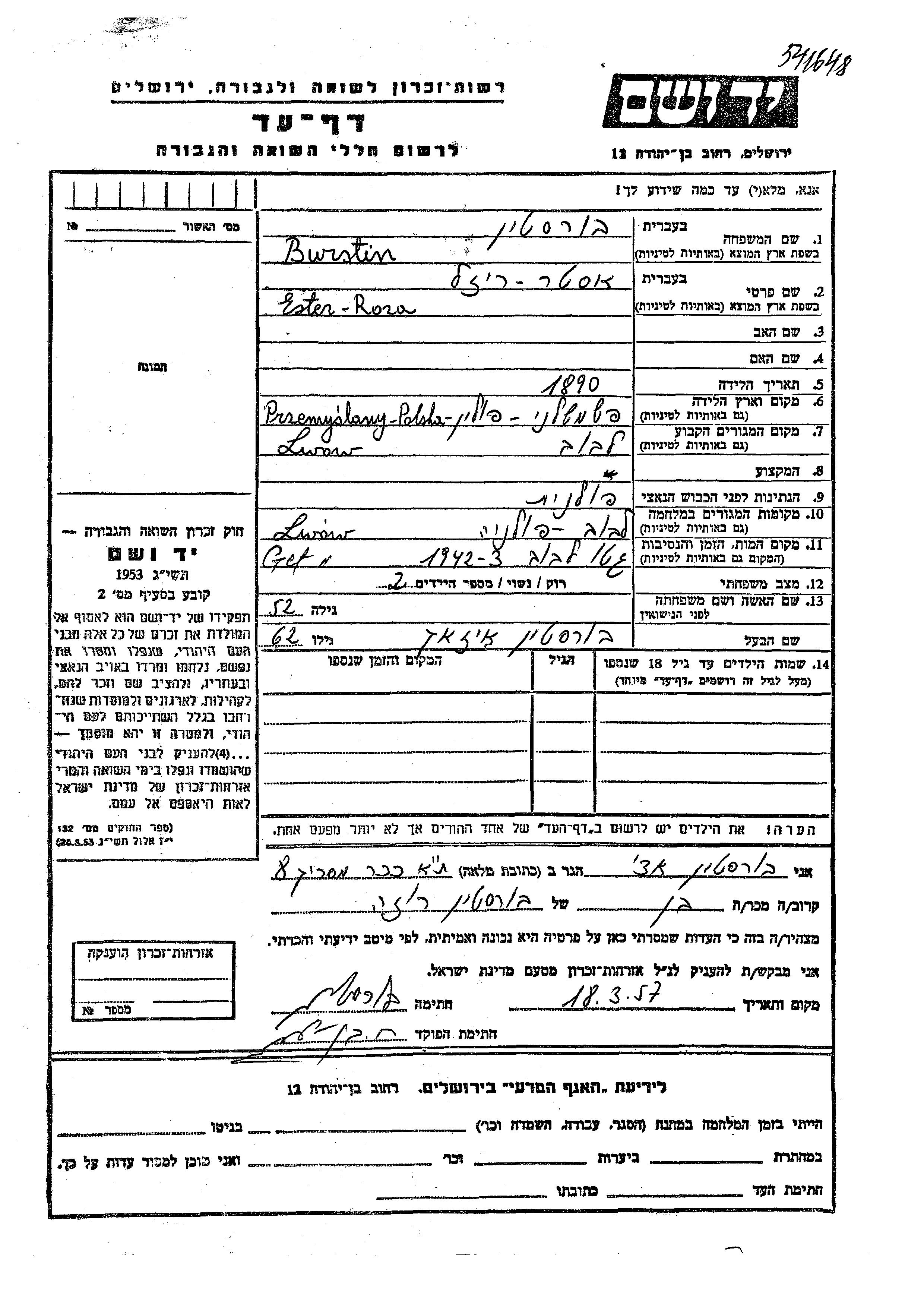 Ester Roza Burstin apellido de soltera Diamond nació en Przemyslany, Polonia en 1890. Antes de la segunda guerra mundial vivía en Lwow, Polonia.