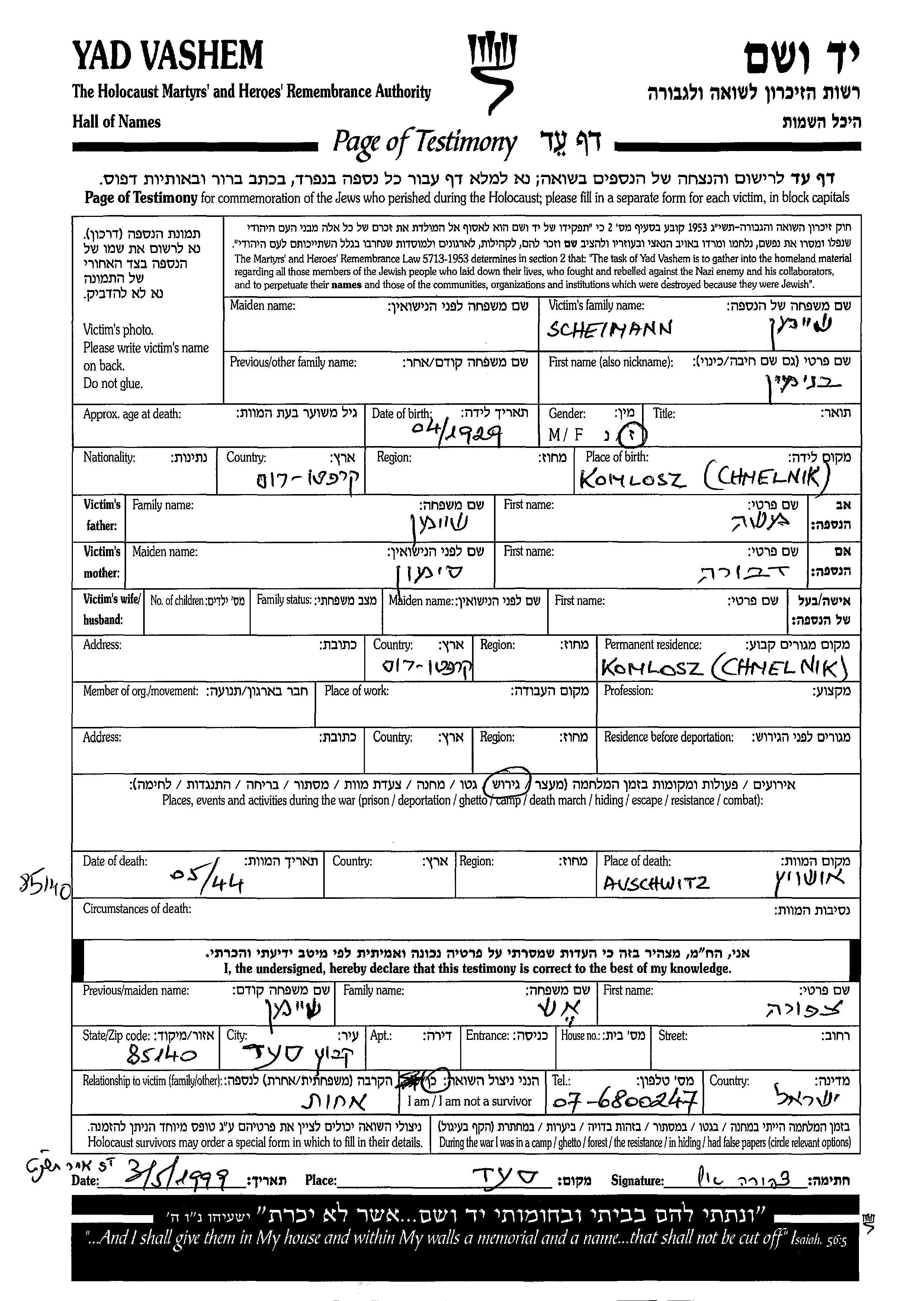 Scheimann | Beniamin | 1929 | Komlos, Checoslovaquia | Hoja de Testimonio |
