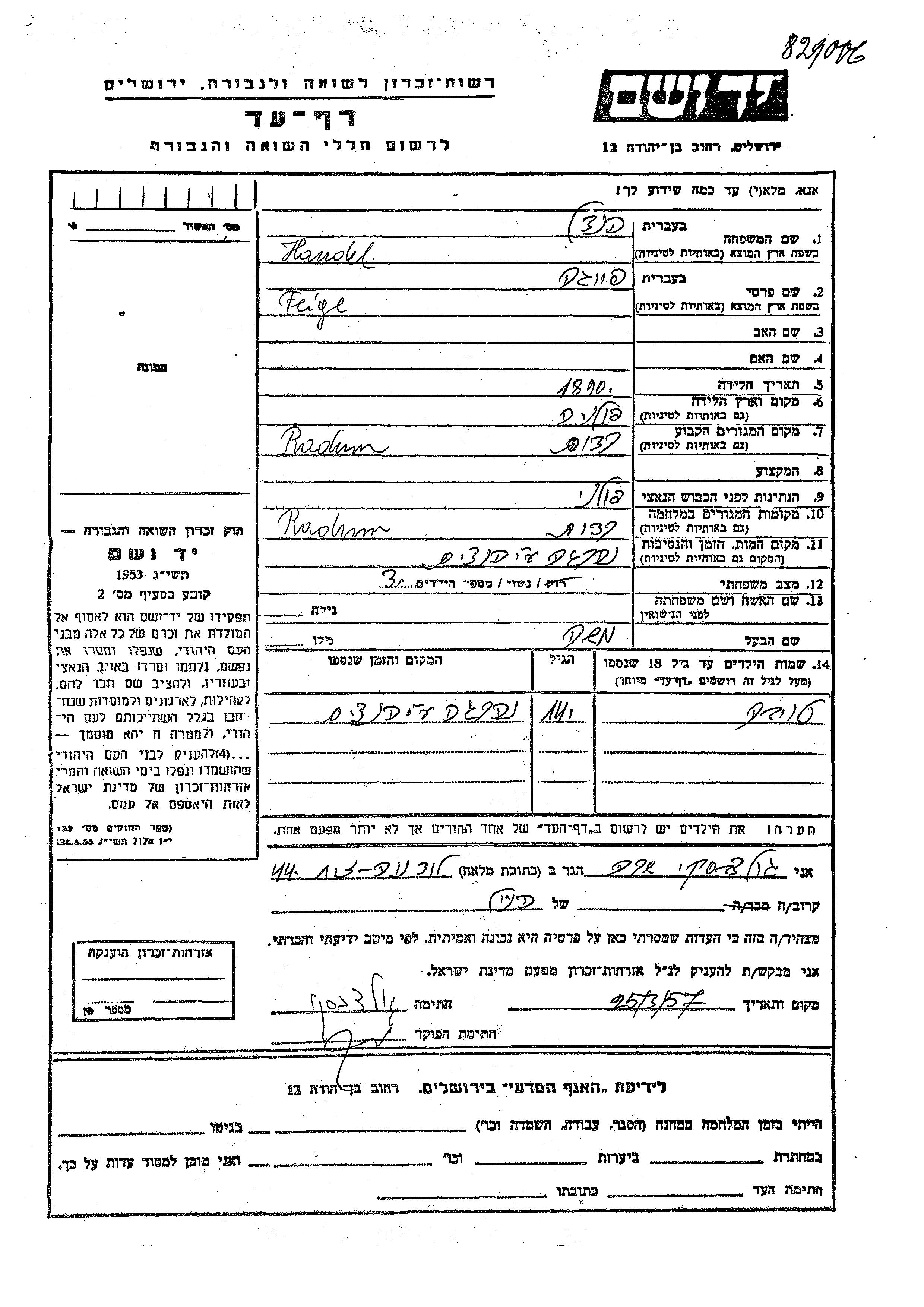 Hendel Feiga 1890 Radun, Polonia Hoja de Testimonio