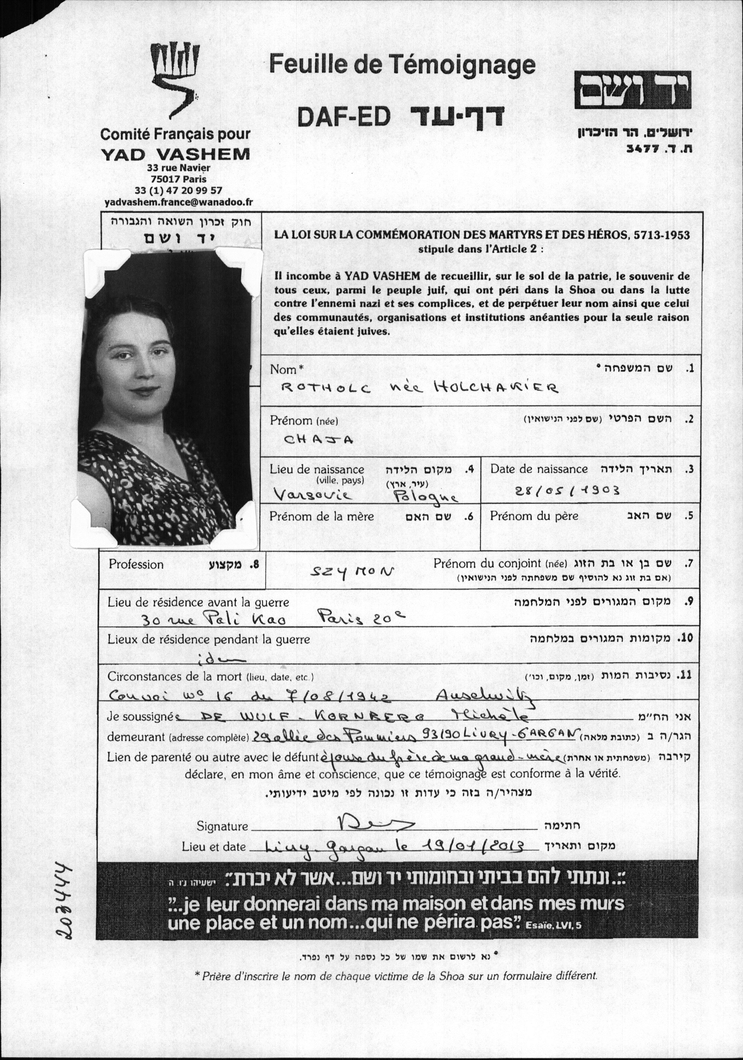 Rotholc Chaja 1903 Paris, Francia Hoja de Testimonio