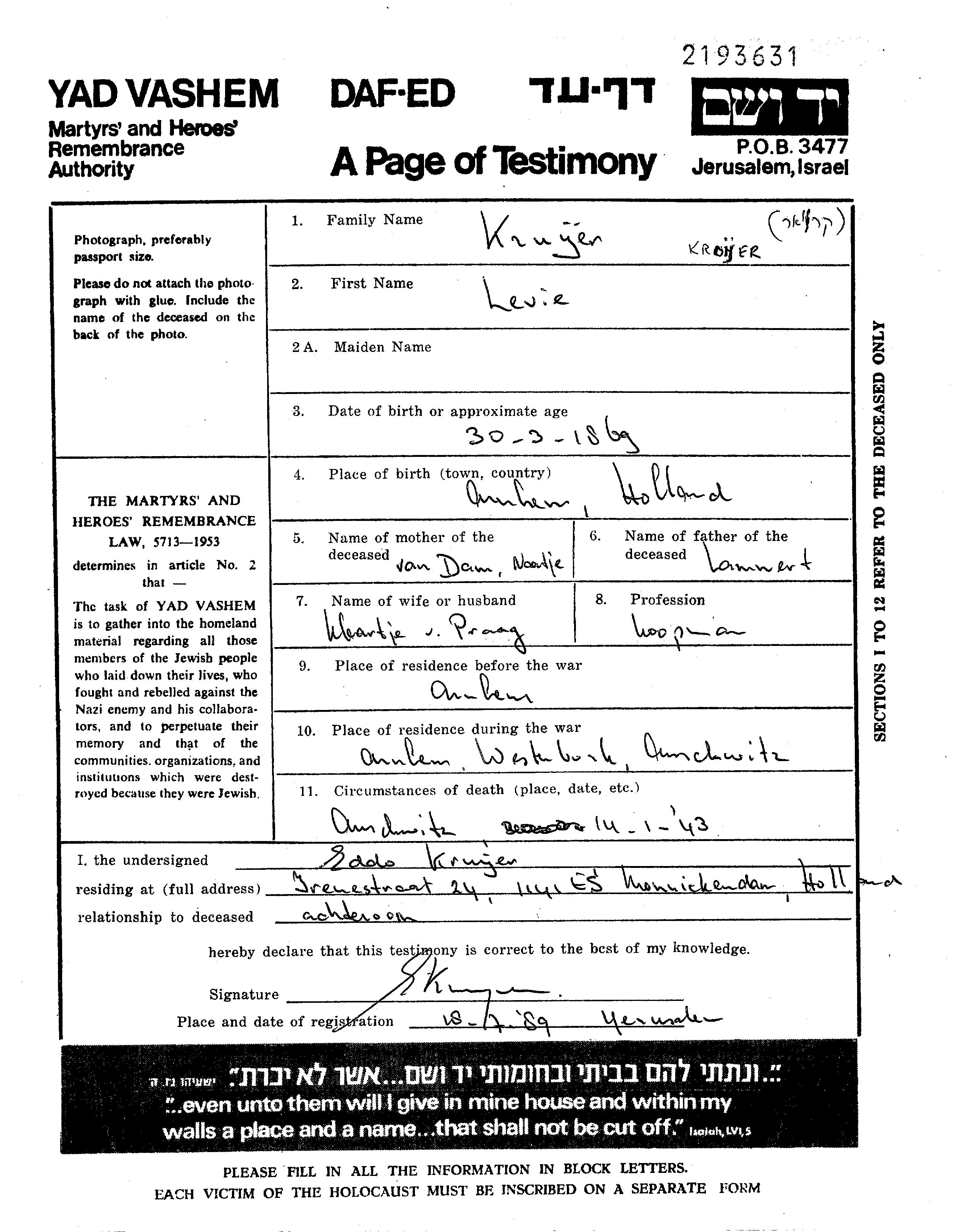Kruijer | Levie | 1869 | Arnhem, Holanda | Hoja de Testimonio |