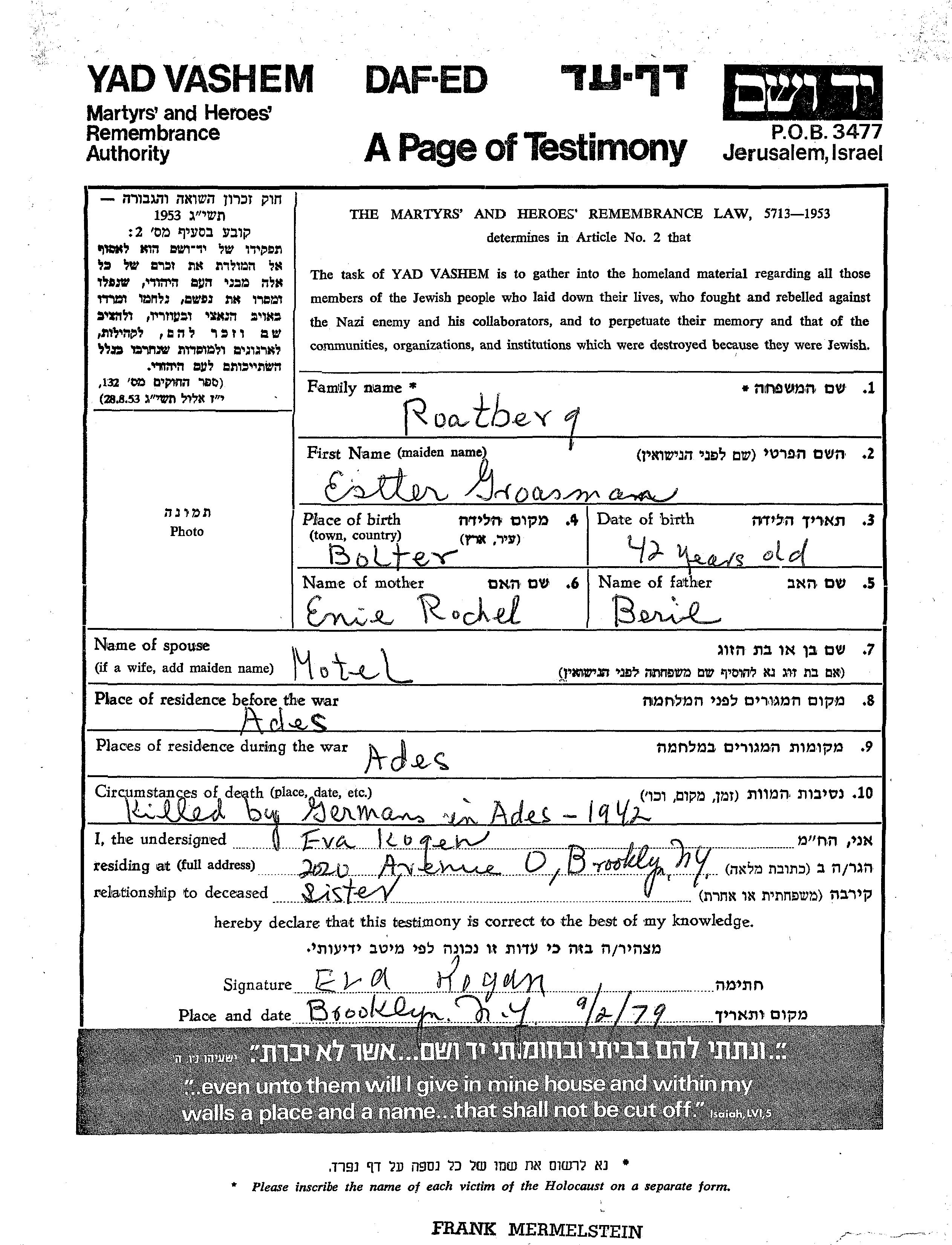 Roatberg Esther Ades, Rumania Hoja de Testimonio