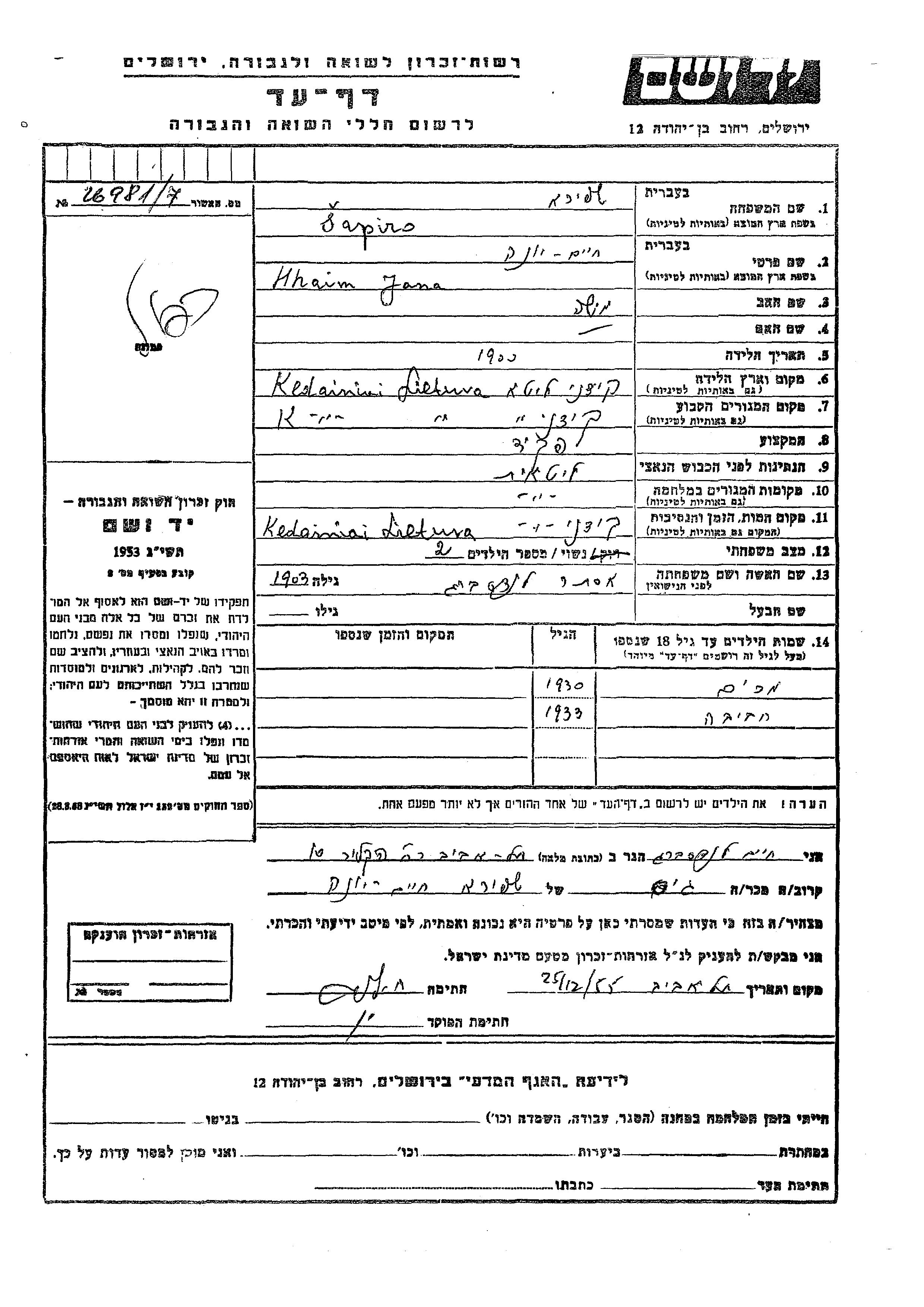 Szapiro | Chaim Jona | 1906 | Kaidan, Lituania | Hoja de Testimonio |