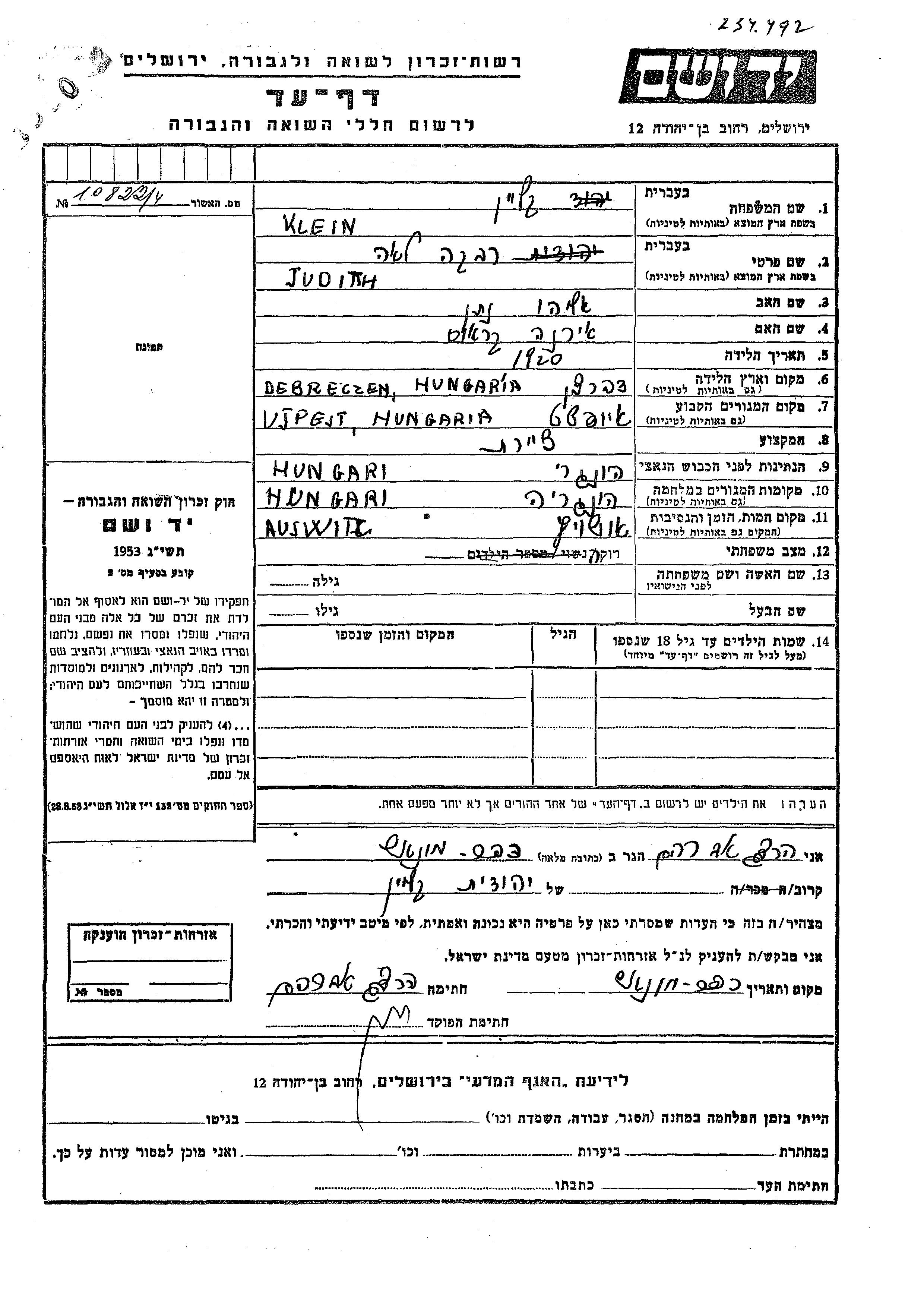 Klein | Judith Rivka Lea | 1920 | Ujpest, Hungría | Hoja de Testimonio |