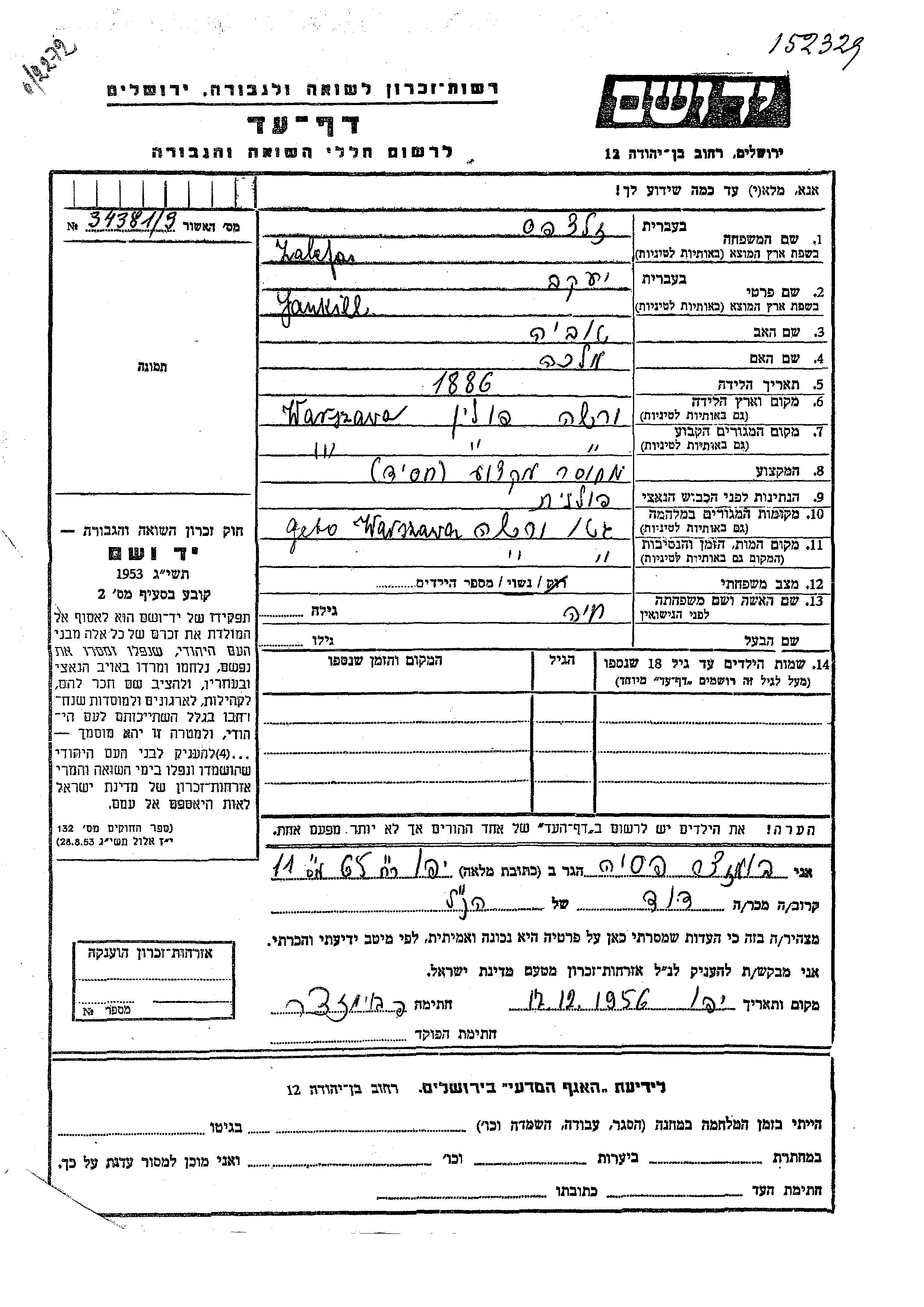 | Zalcfas | Yaakov | Warsaw, Polonia | Hoja de Testimonio |