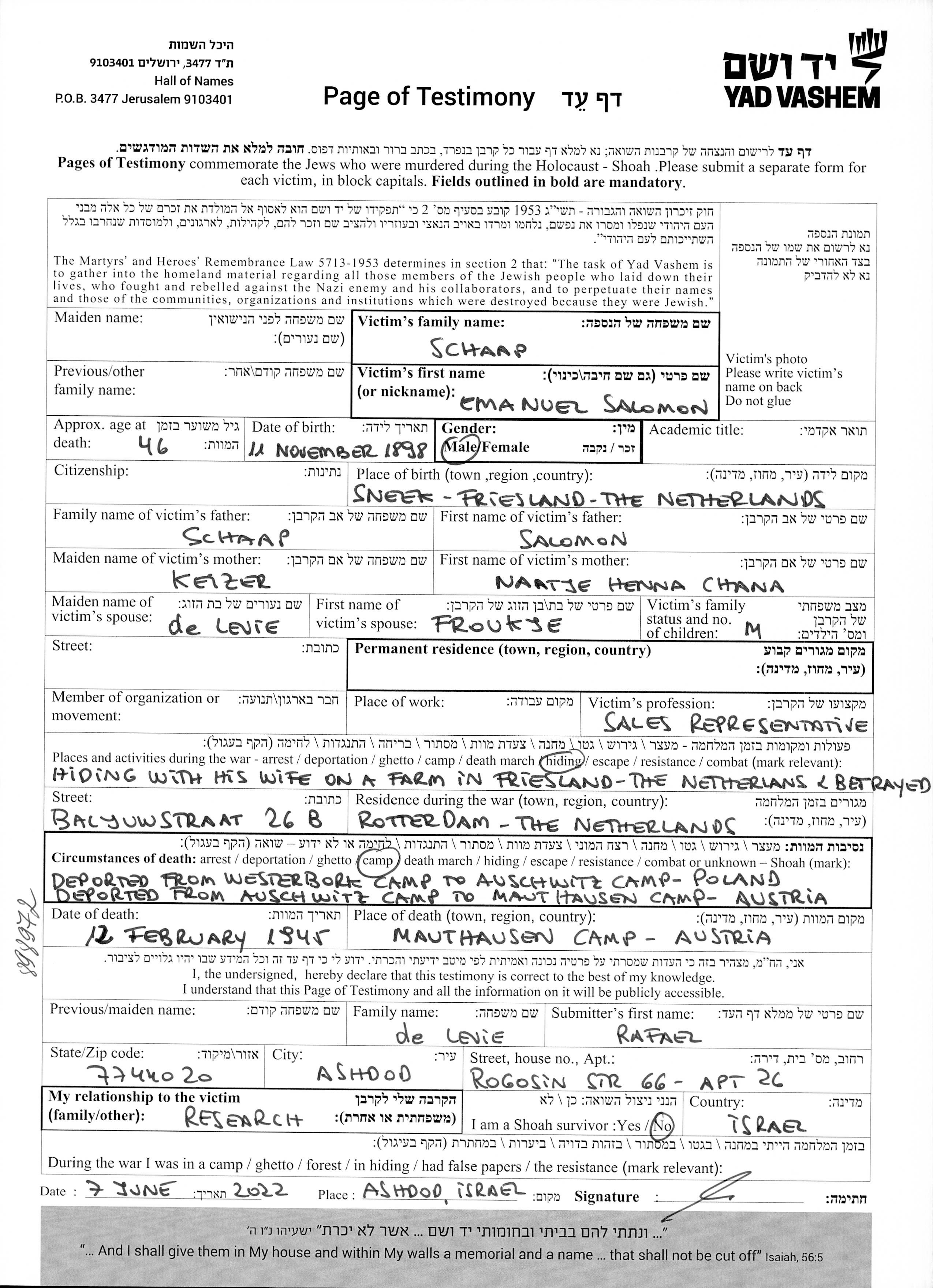 | Schaap | Emanuel Salomon | 1898 | lugar desconocido, | Hoja de Testimonio |