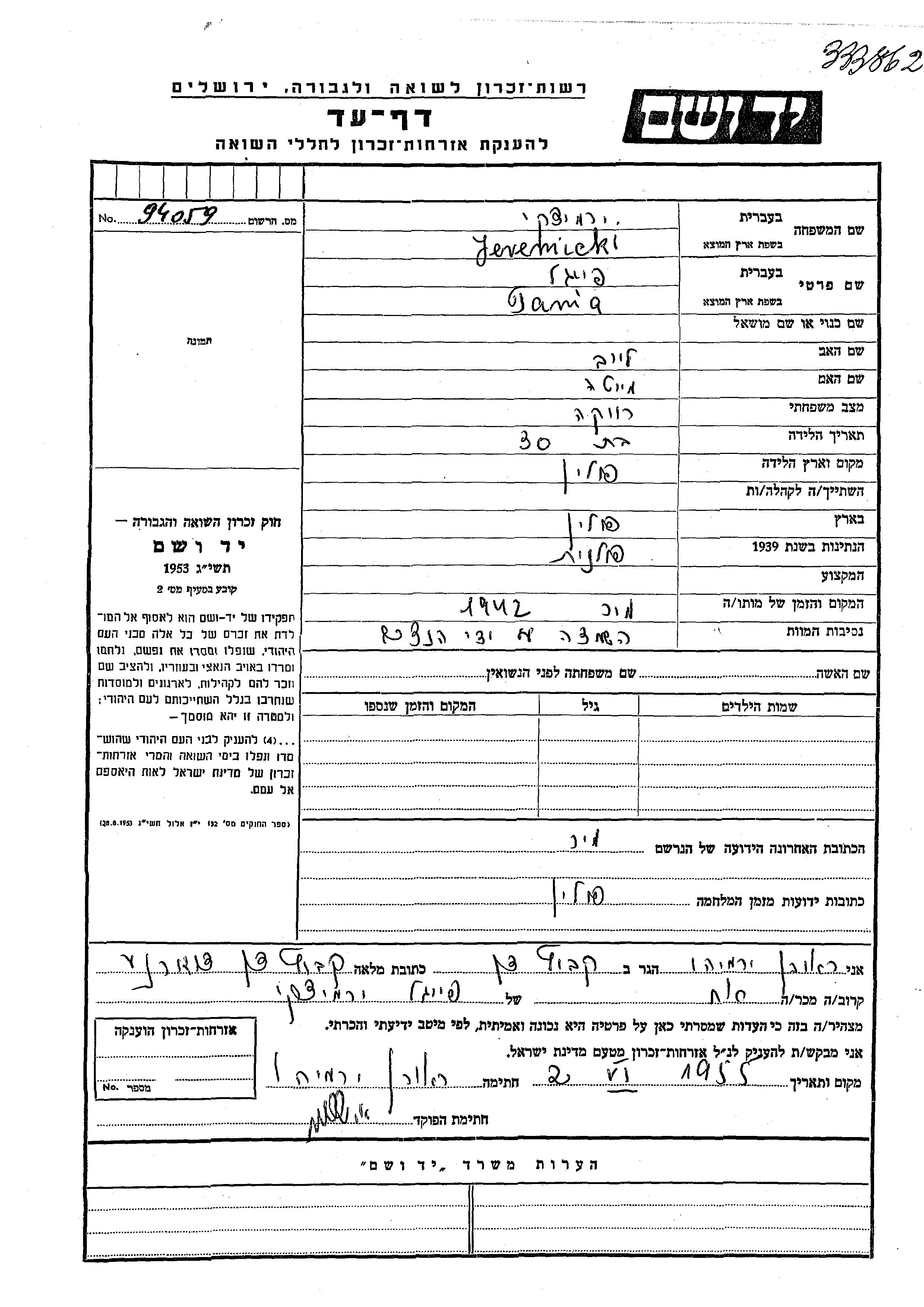 Yad Vashem - Colección conmemorativa de Hojas de Testimonio