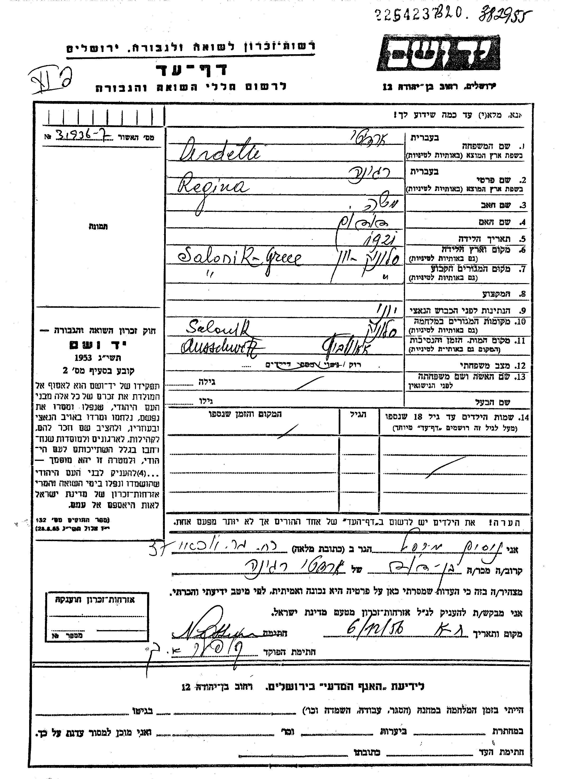 Ardetti Regina 1921 Saloniki, Grecia Hoja de Testimonio