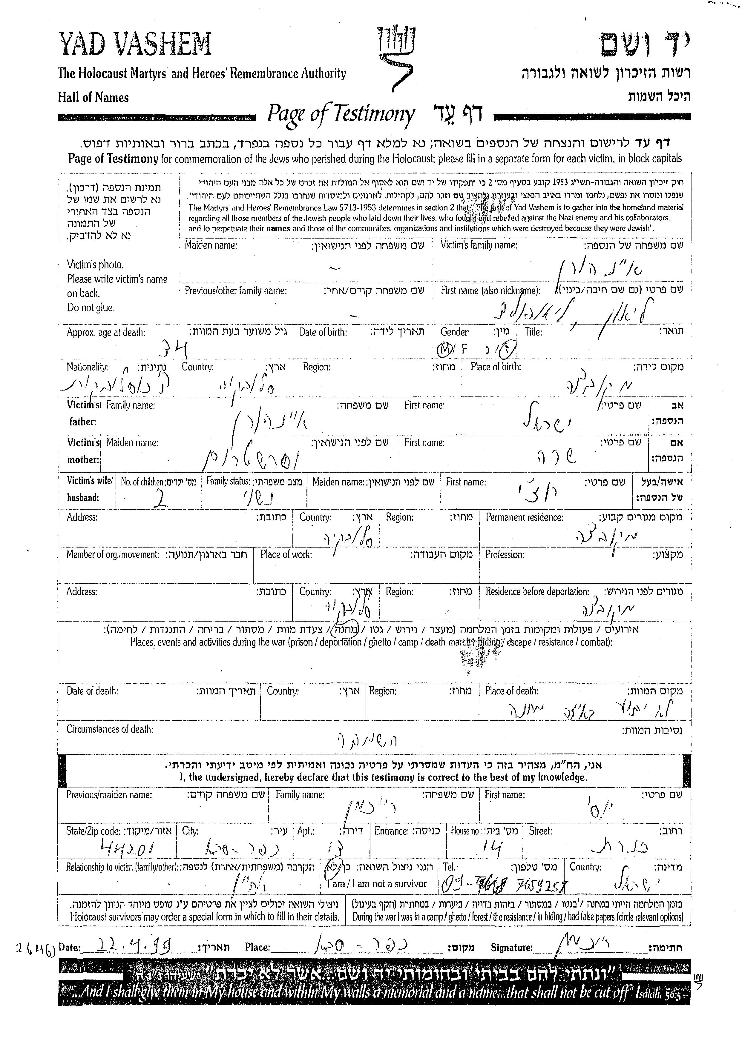Yad Vashem - Colección conmemorativa de Hojas de Testimonio