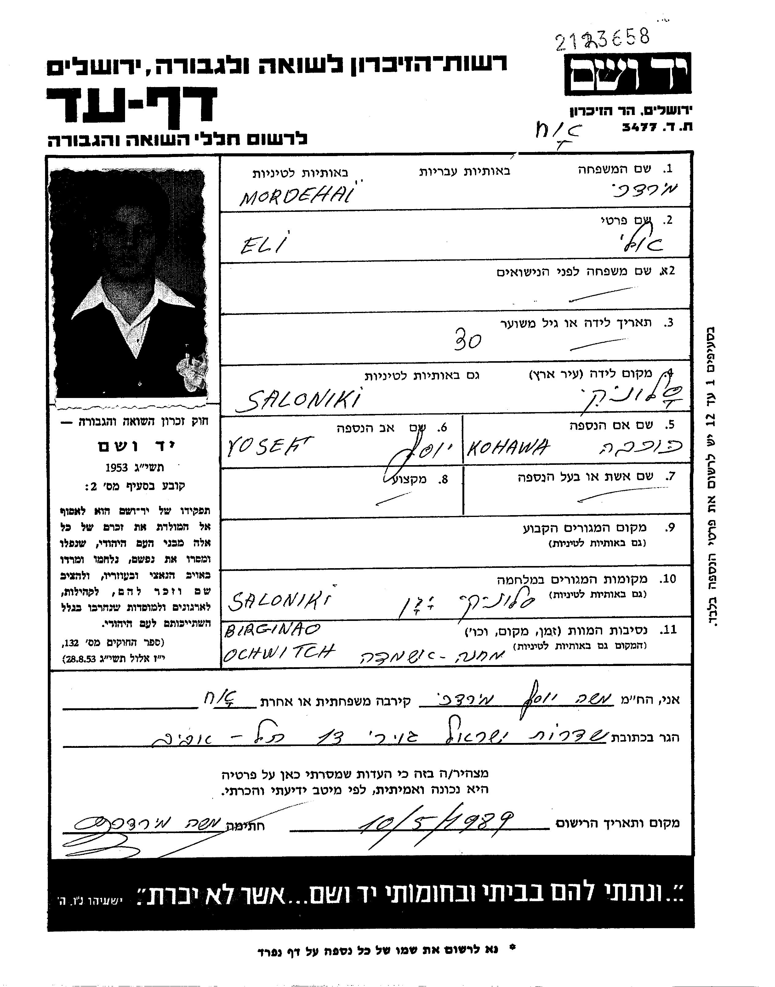 Eliahu Mordehai nació en Saloniki, Grecia en 1917. Era Tendero/a.