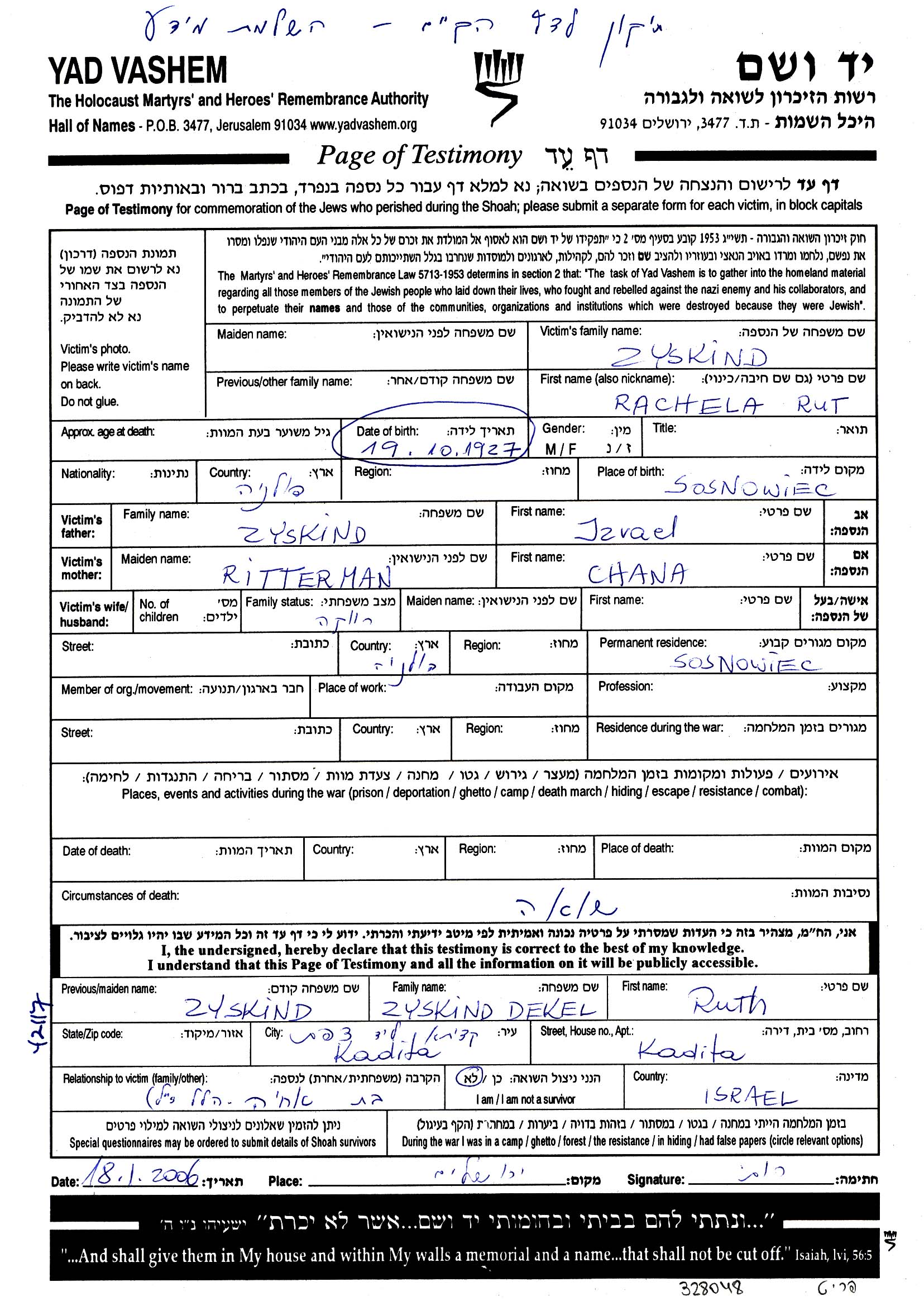 Zyskind Rachela Rut 1927 Sosnowiec, Polonia Hoja de Testimonio