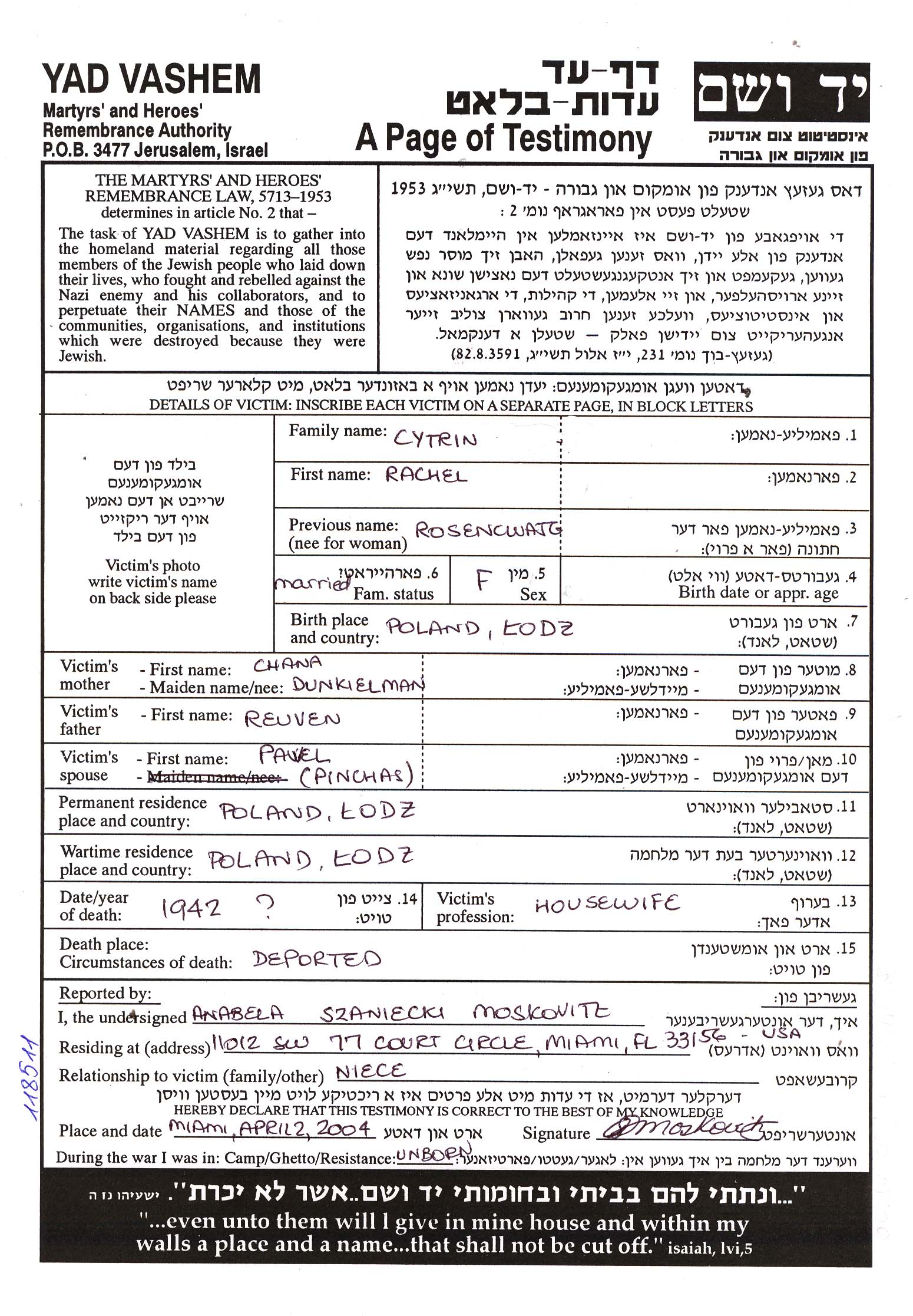 Cytrin Rachel Lodz, Polonia Hoja de Testimonio