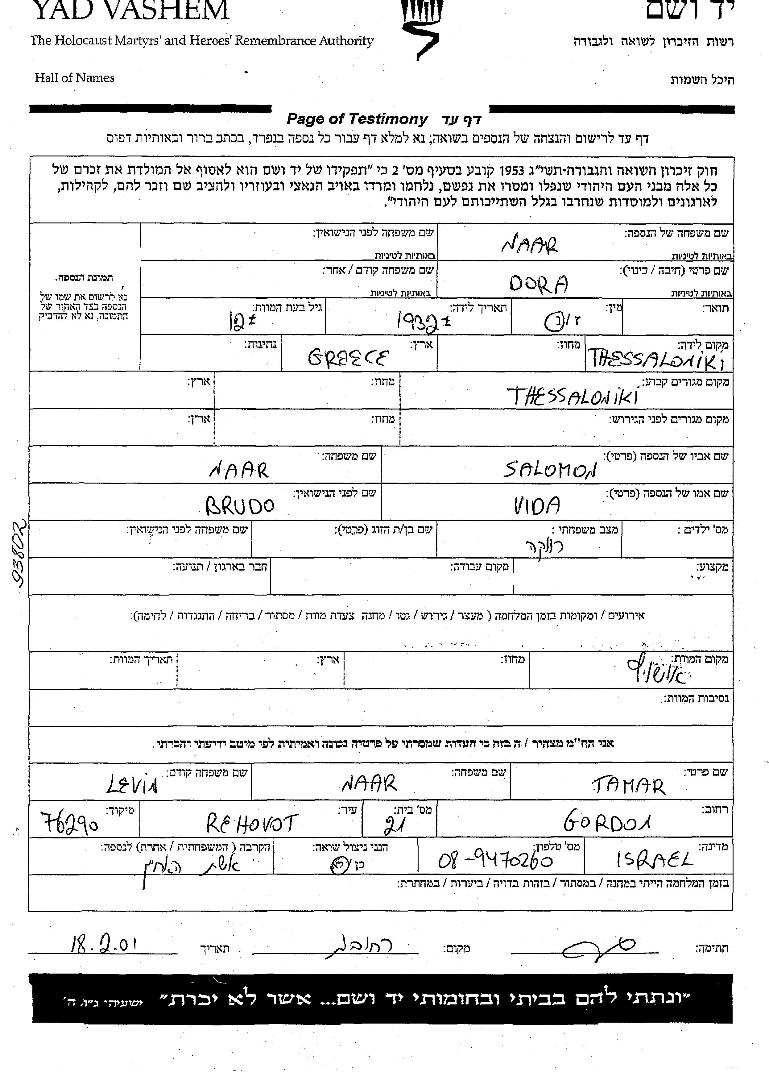 Naar | Dora | Thessaloniki, Grecia | Hoja de Testimonio | |