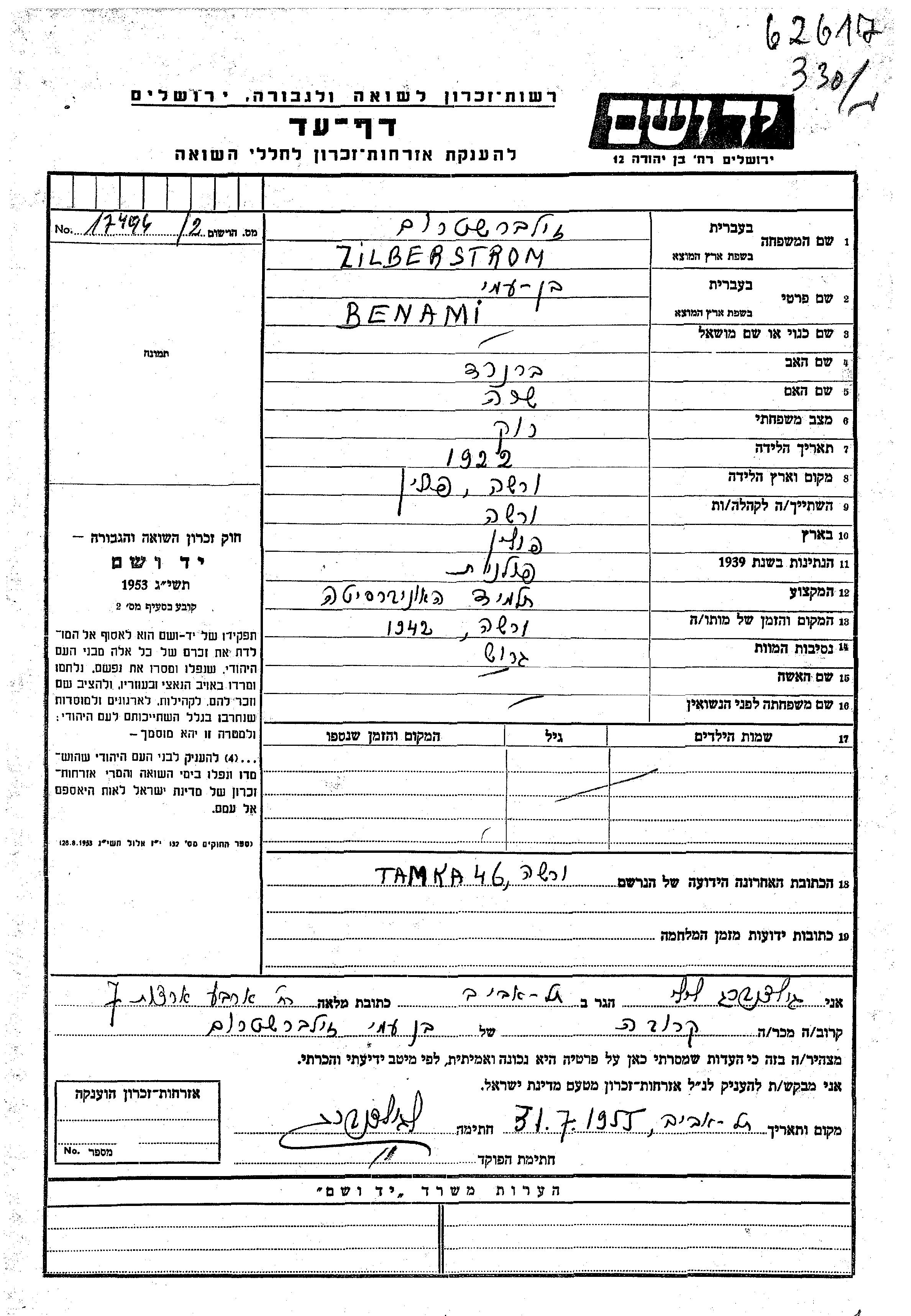 Zilberstrom | Ben Ami | Warszawa, Polonia | Hoja de Testimonio | |