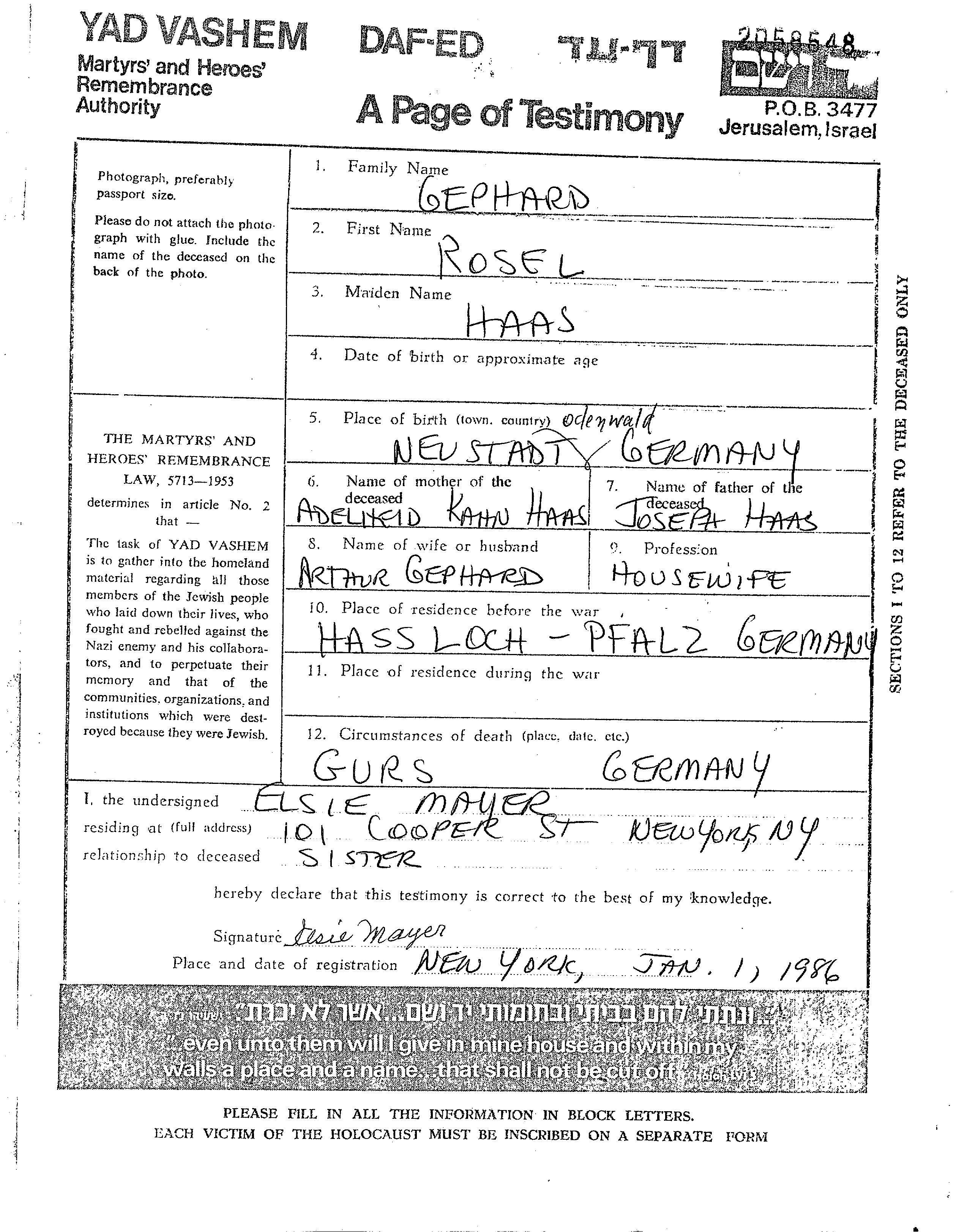 Rosel Gephard apellido de soltera Haas Hes nació en Neustadt, Alemania, hija de Joseph y Adelheid apellido de soltera Kahn Kohen. Era Ama de casa y casada con Arthur. Antes de la segunda guerra mundial vivía en Hassloch, Alemania. Durante la guerra estuvo en Gurs, Francia.