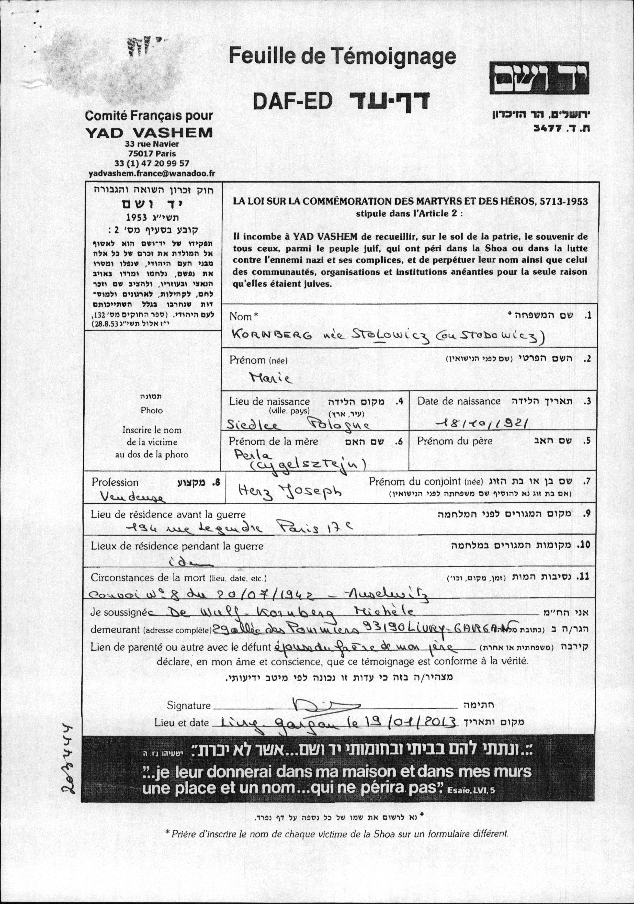 Kornberg | Marie | 1921 | Paris, Francia | Hoja de Testimonio |