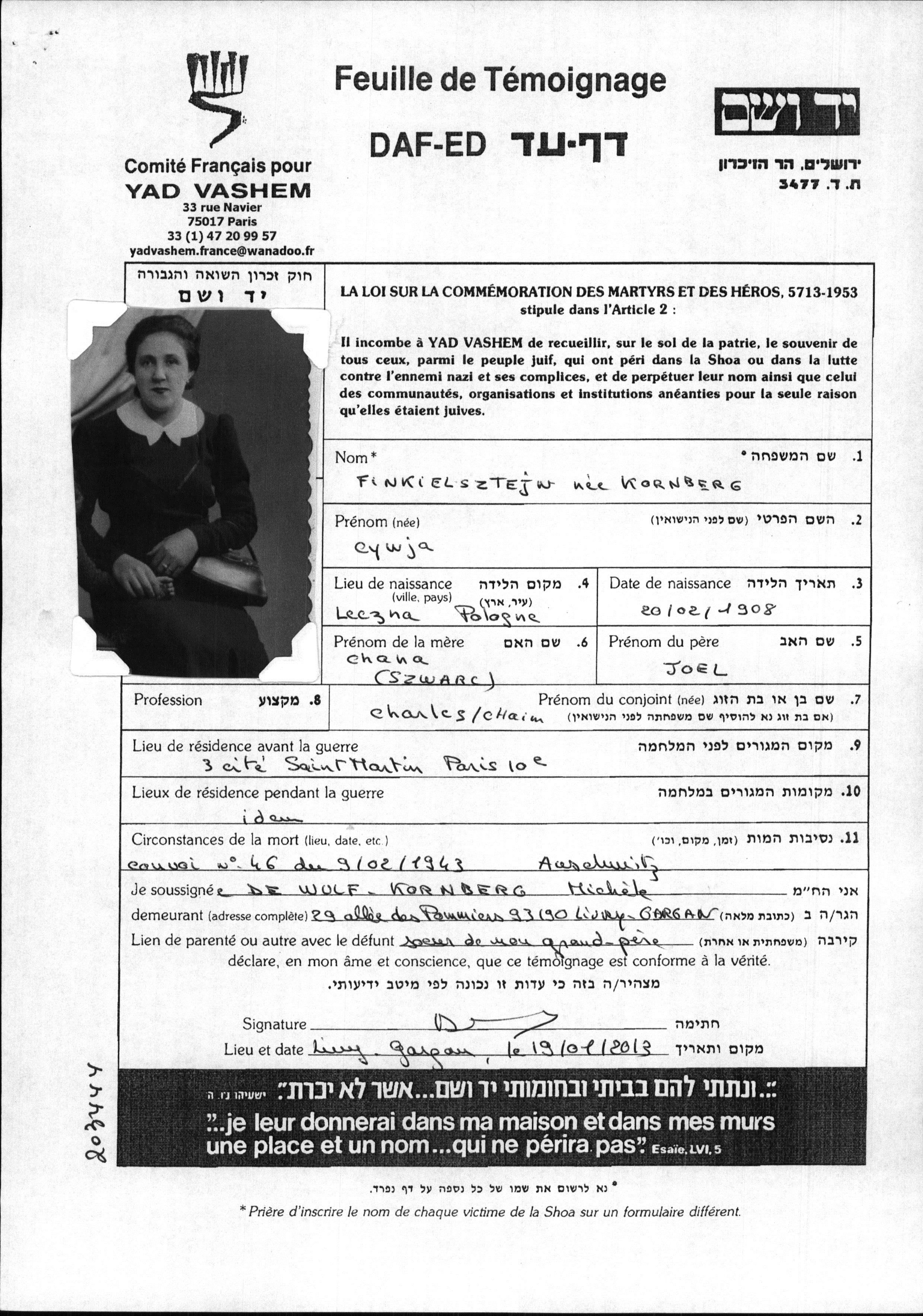 Finkelsztejn Cywja 1908 Paris, Francia Hoja de Testimonio