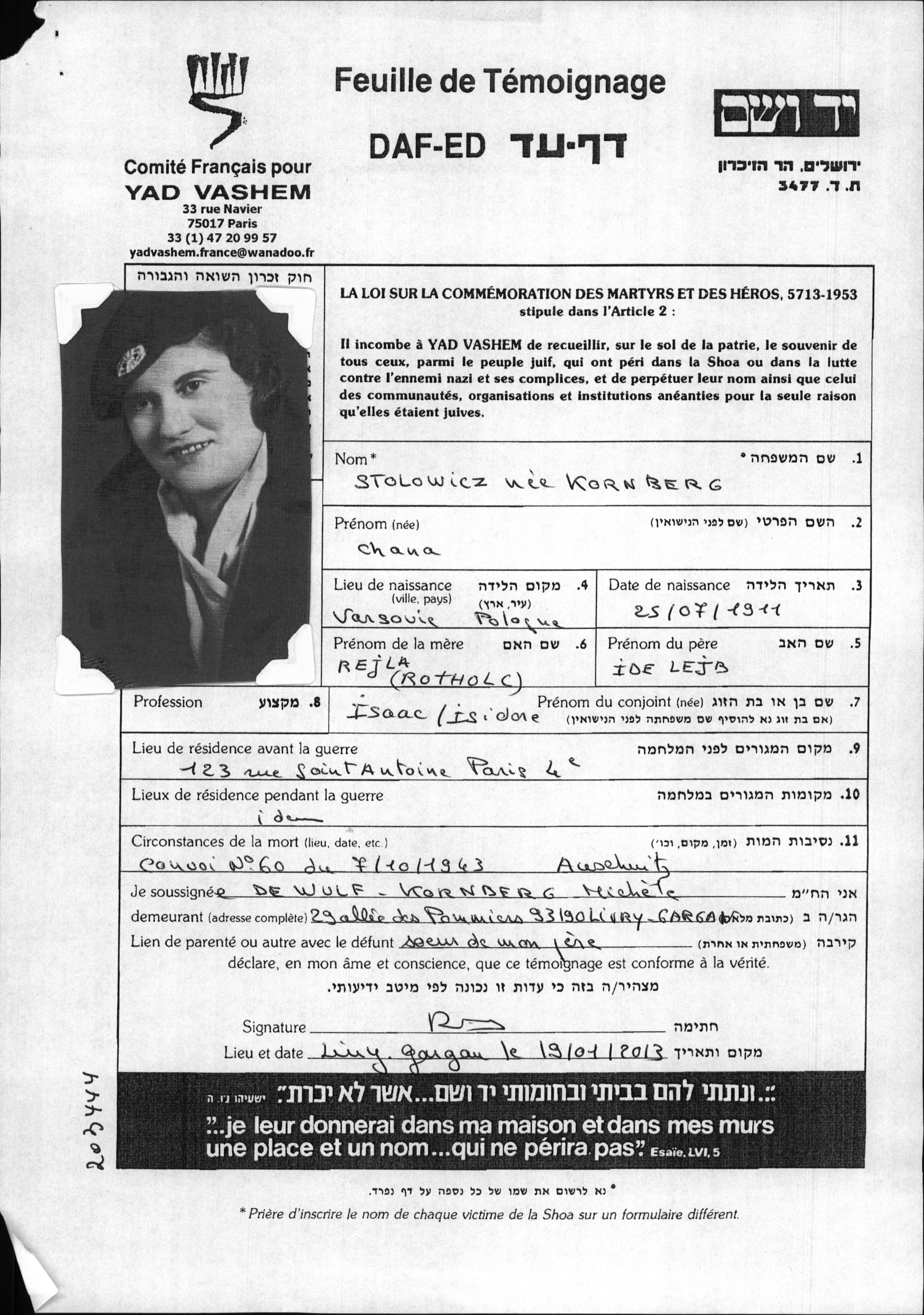 Chana Stolowicz apellido de soltera Kornberg nació en Warszawa, Polonia en 1911. Antes de la segunda guerra mundial vivía en Paris, Francia.