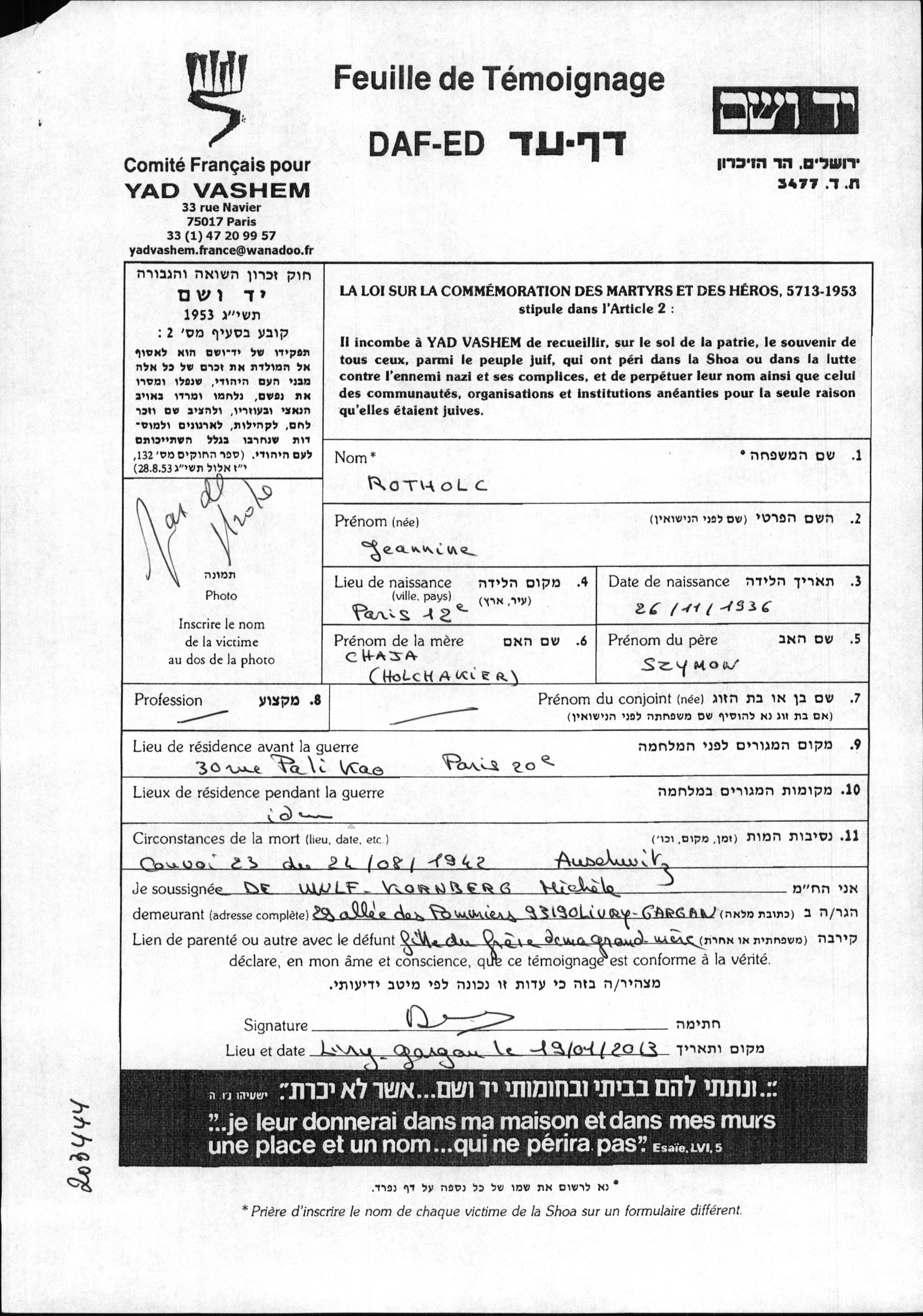 Rotholc | Jeannine | 1936 | Paris, Francia | Hoja de Testimonio |