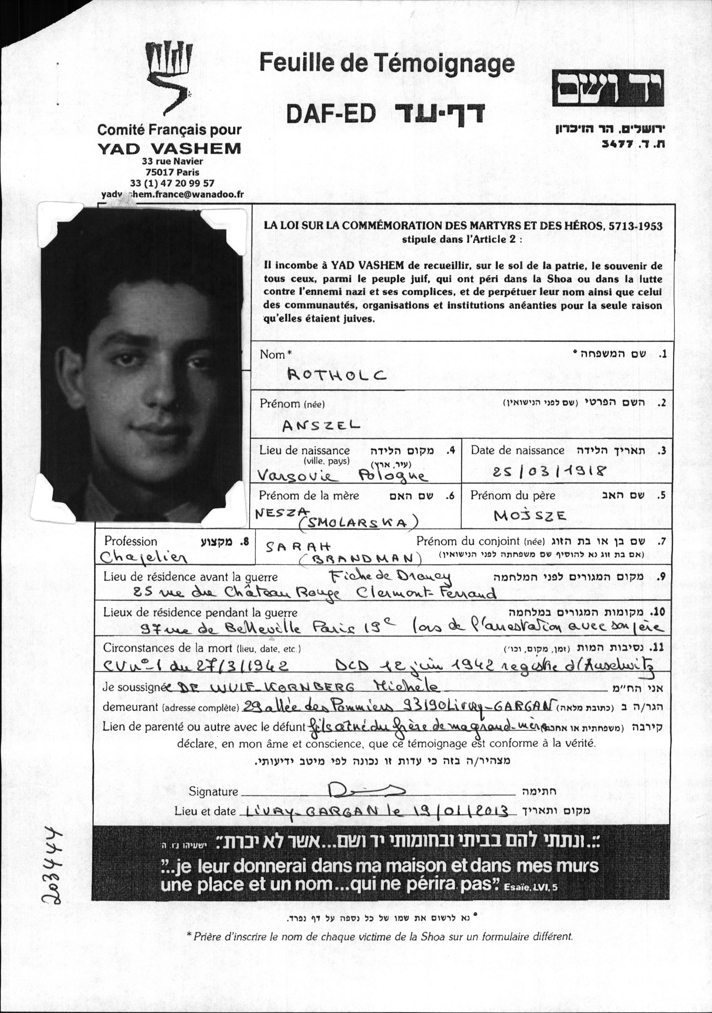 Anszel Rotholc nació en Warszawa, Polonia en 1918. Era Sombrerero/a. Antes de la segunda guerra mundial vivía en Clermont Ferrand, Francia.