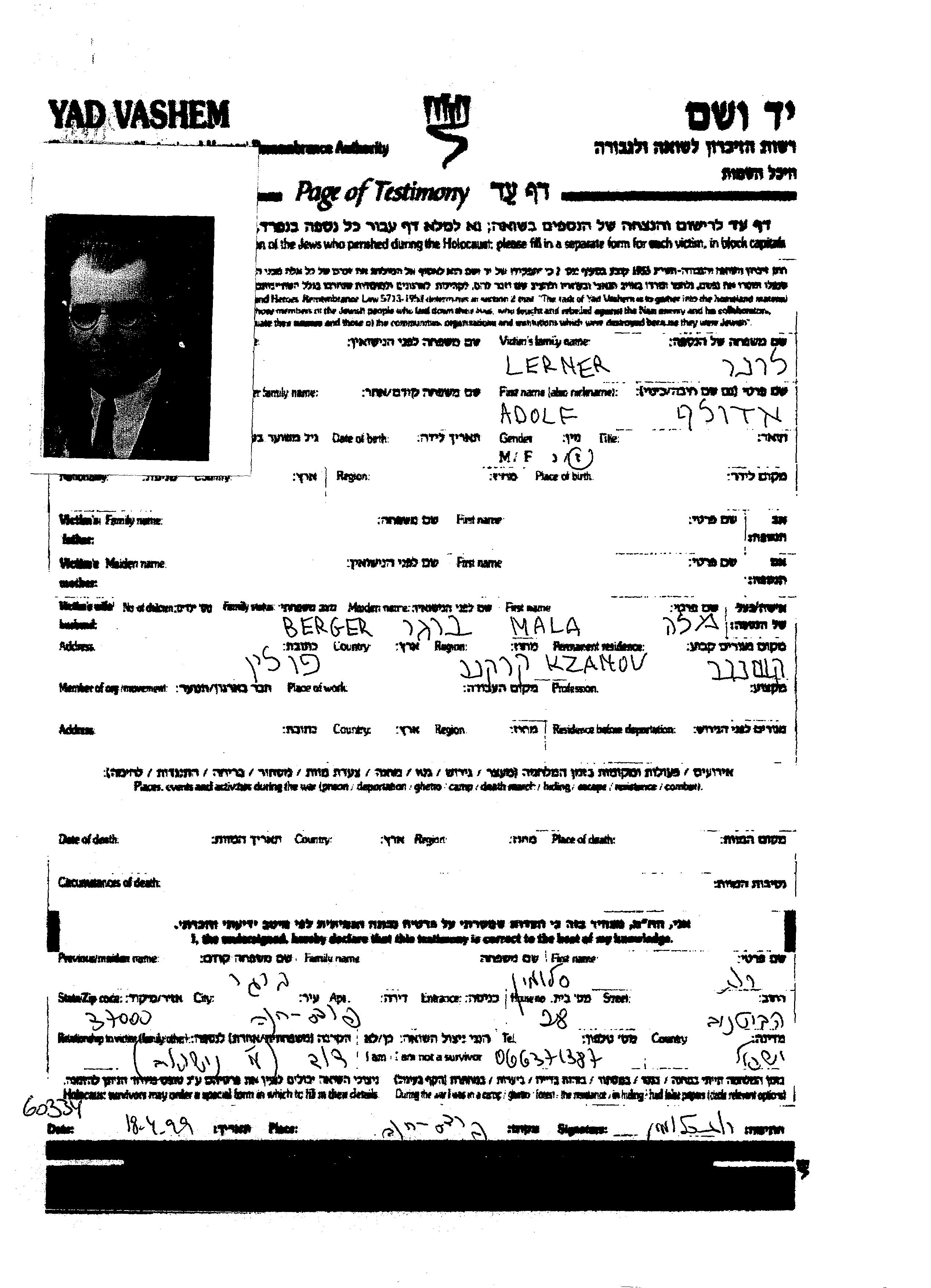 Lerner | Adolf | Chrzanow, Polonia | Hoja de Testimonio | |