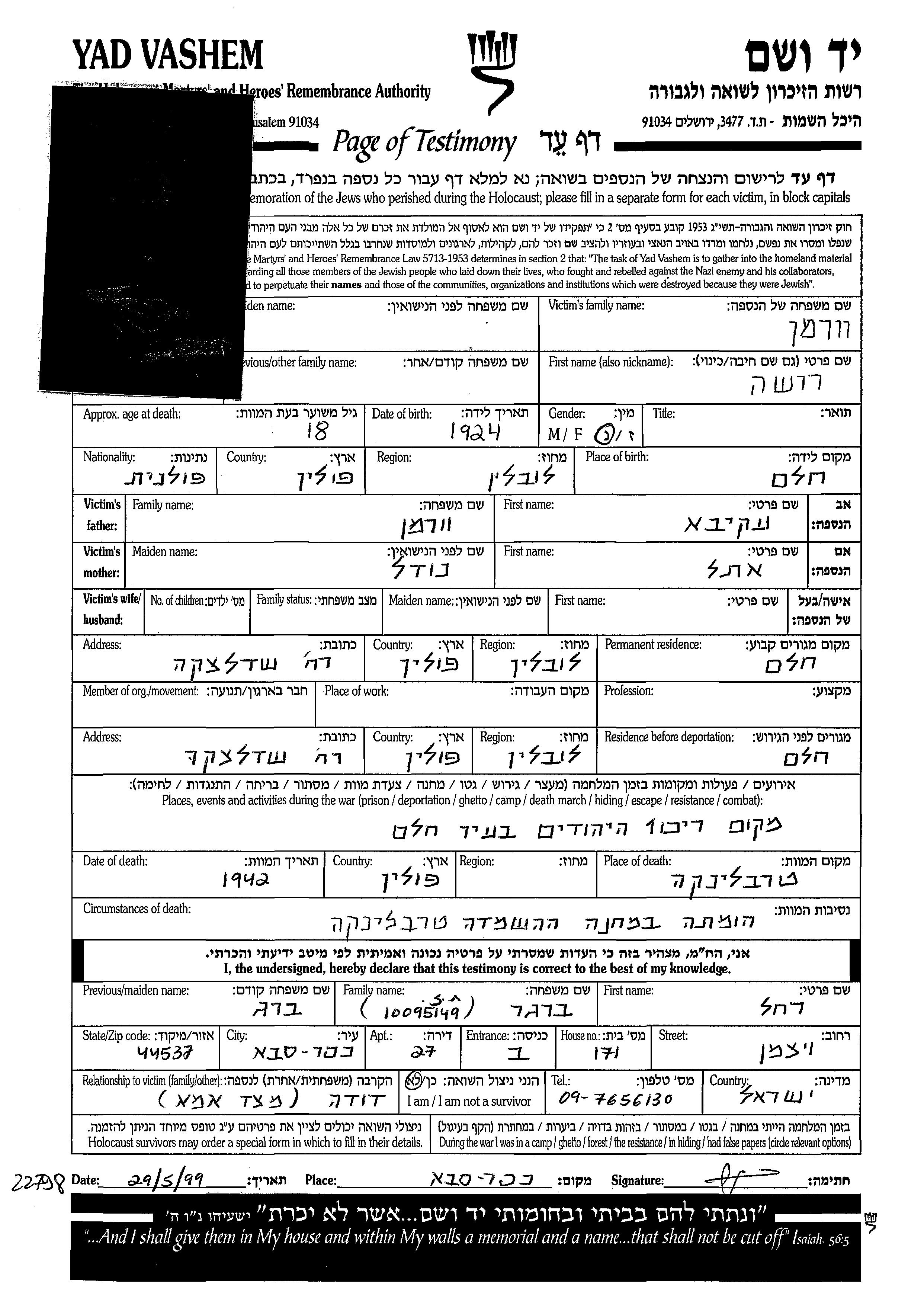 Yad Vashem - Colección conmemorativa de Hojas de Testimonio