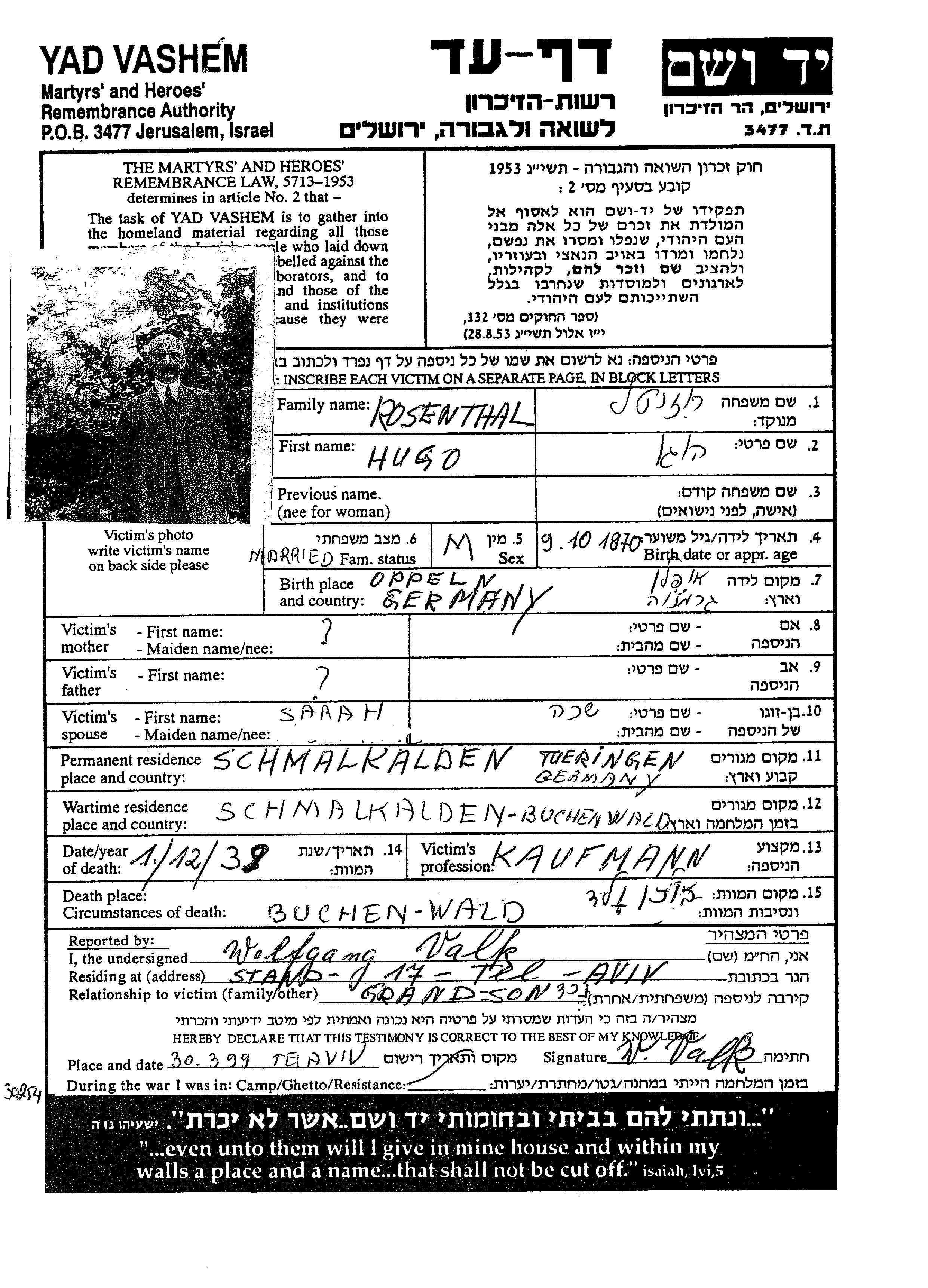 Hugo fue asesinado durante la Shoá. Lugar de la muerte: Buchenwald, Alemania en 01/12/1939.