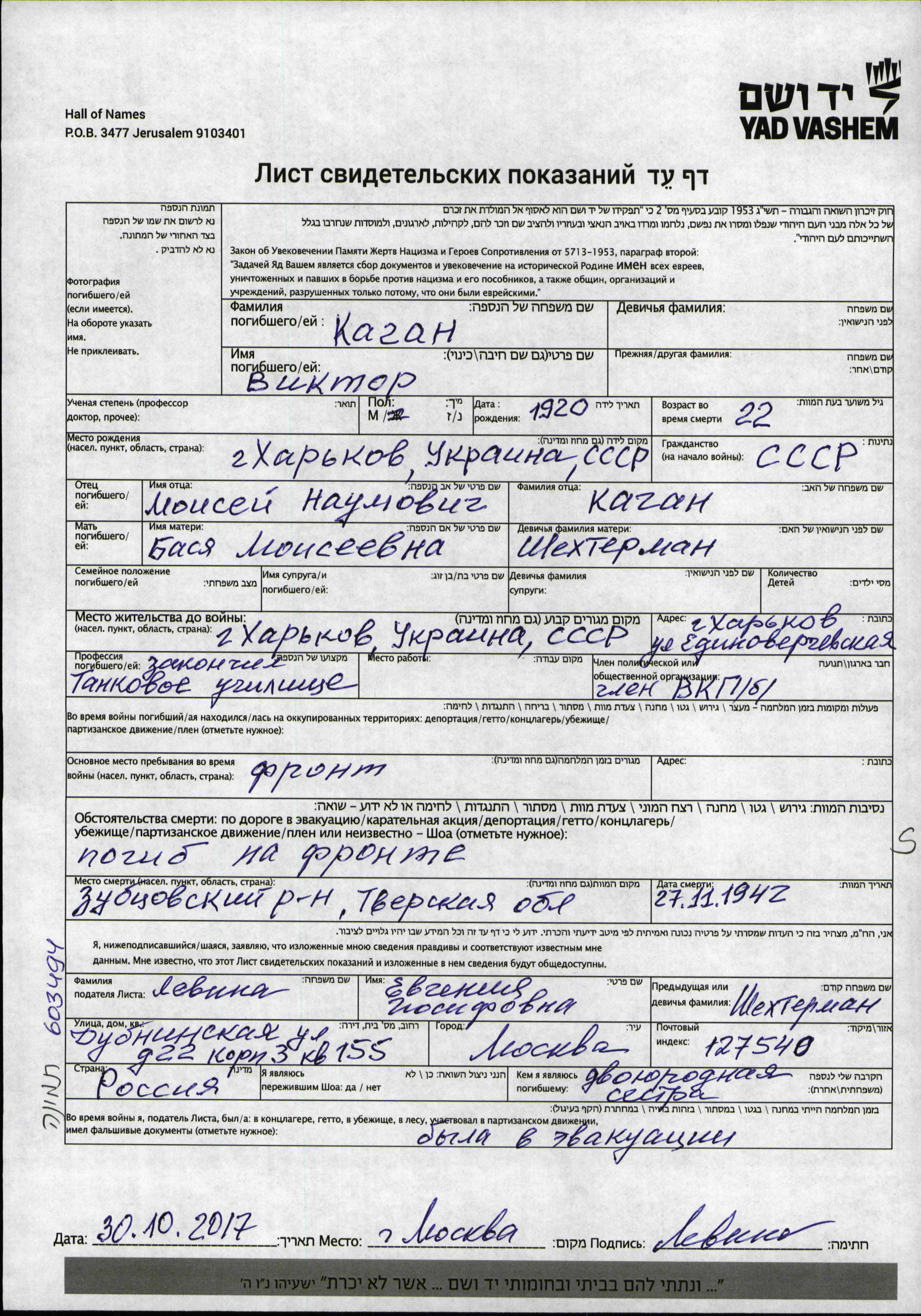 Kagan Viktor 1920 Kharkov, Ucrania (URSS) Hoja de Testimonio