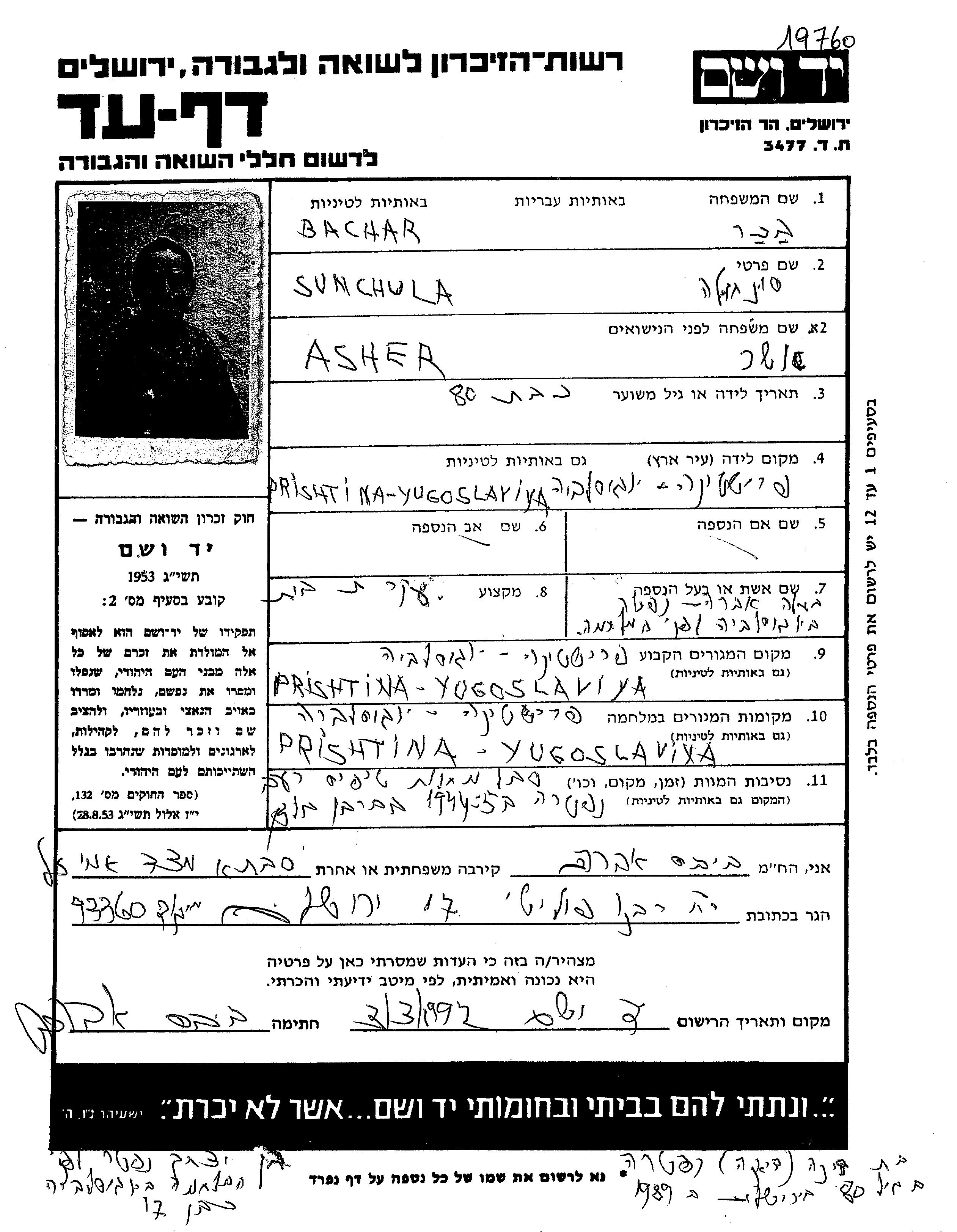 Bachar Bekher | Sunchula | Pristina, Yugoslavia | Hoja de Testimonio | |