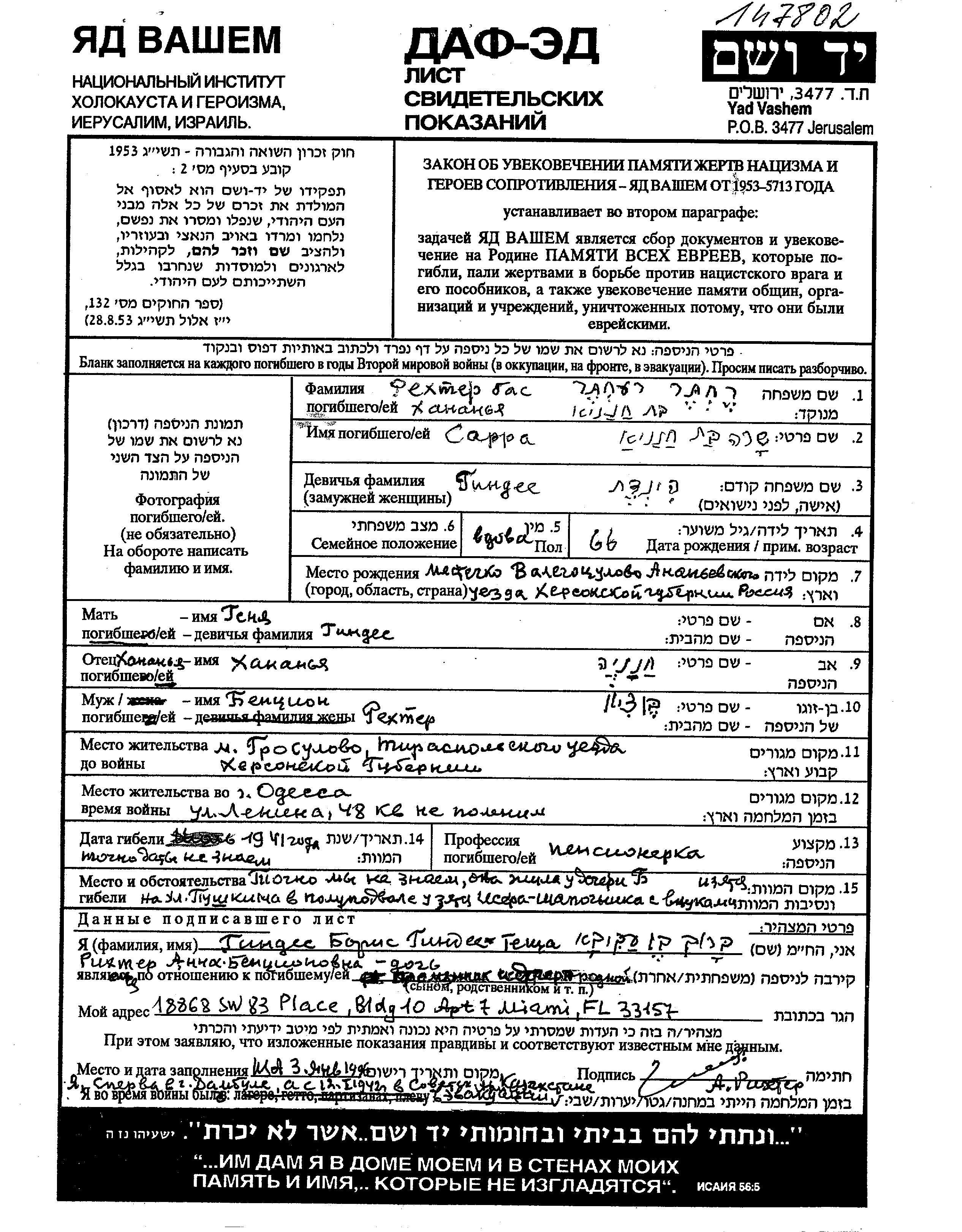 Rekhter Sara 1886 Grosulovo, Ucrania (URSS) Hoja de Testimonio