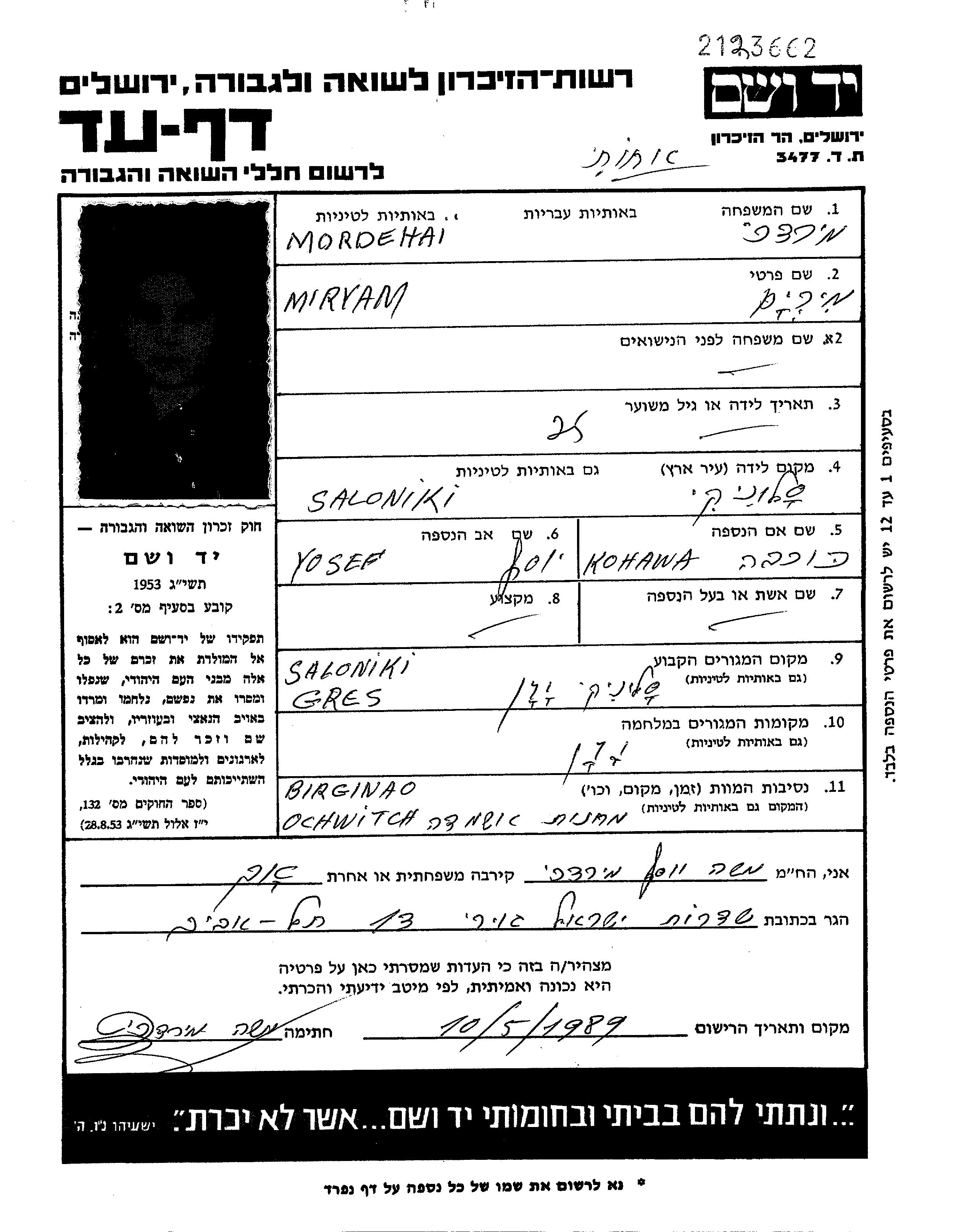 Miryam Mordehai nació en Thessaloniki, Grecia. Antes de la segunda guerra mundial vivía en Thessaloniki, Grecia.