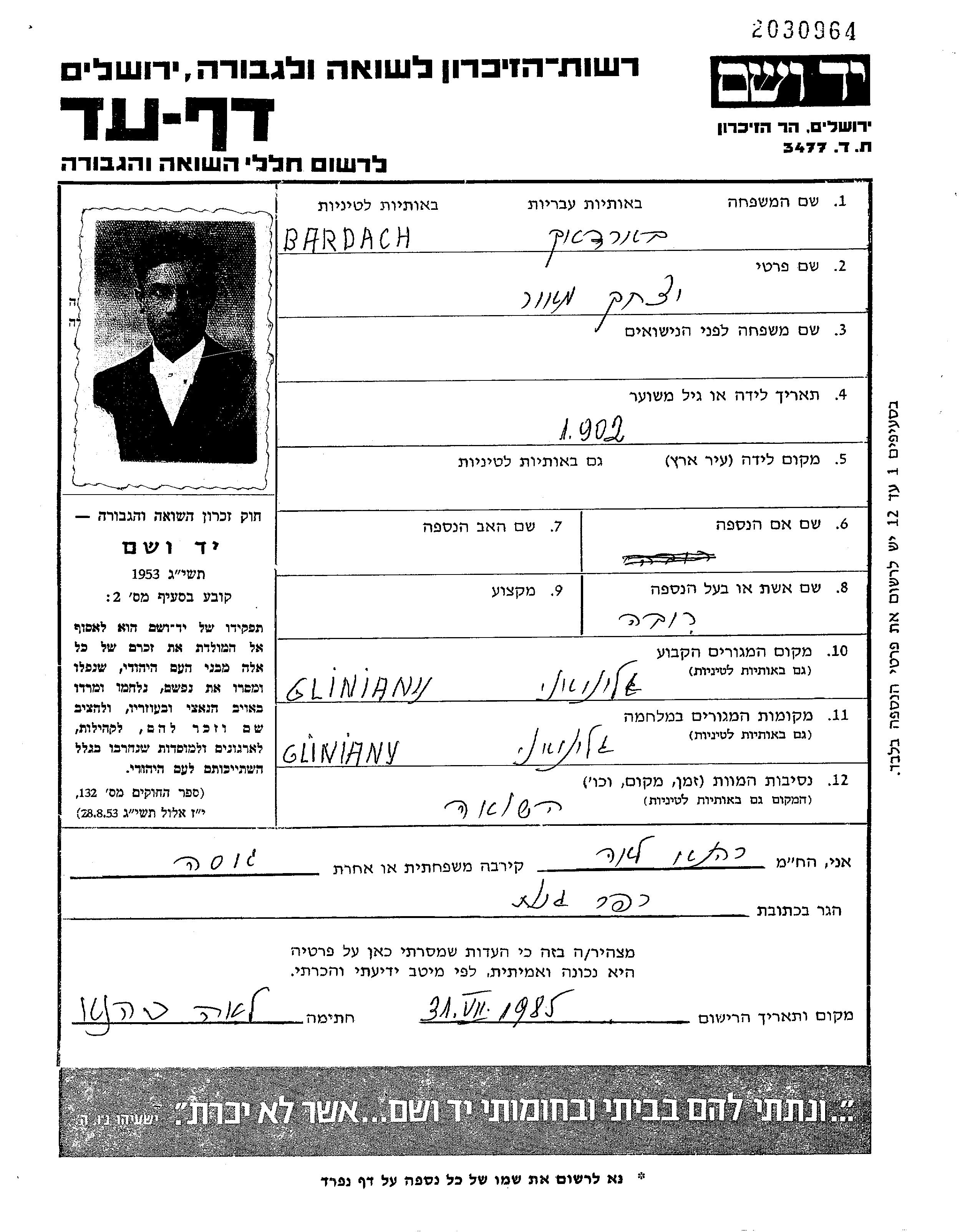 Bardach Ytzkhak Meir 1902 Gliniany, Polonia Hoja de Testimonio