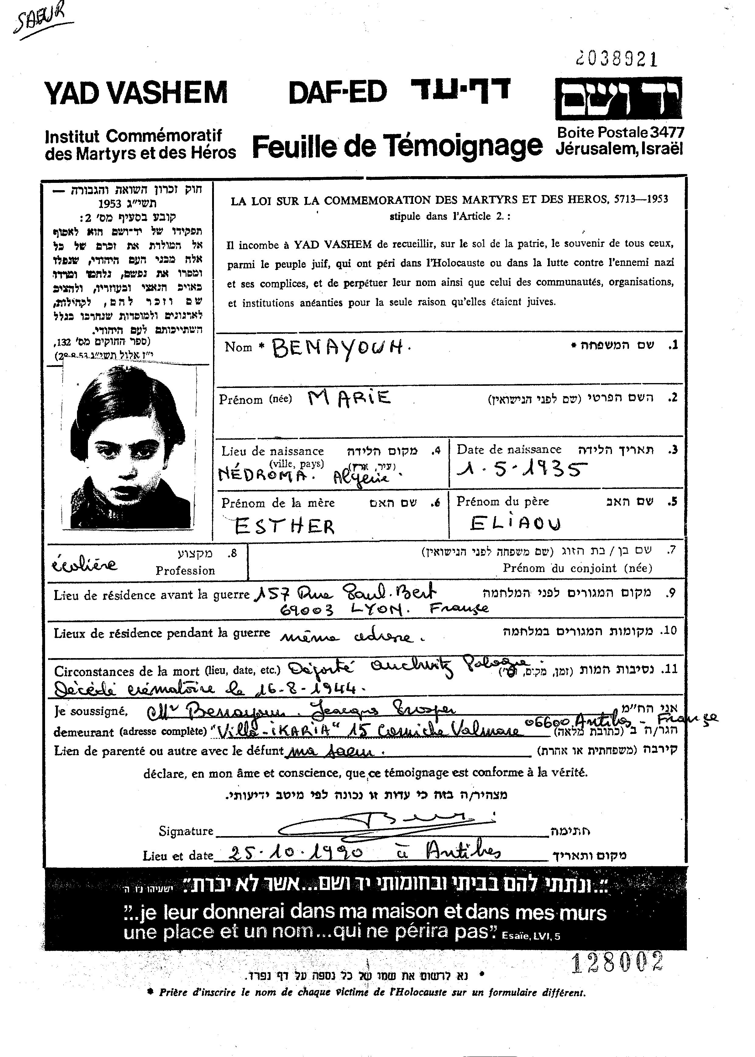 Marie Benayoun nació en Nedroma, Argelia en 1935. Era Alumno/a. Antes de la segunda guerra mundial vivía en Lyon, Francia.