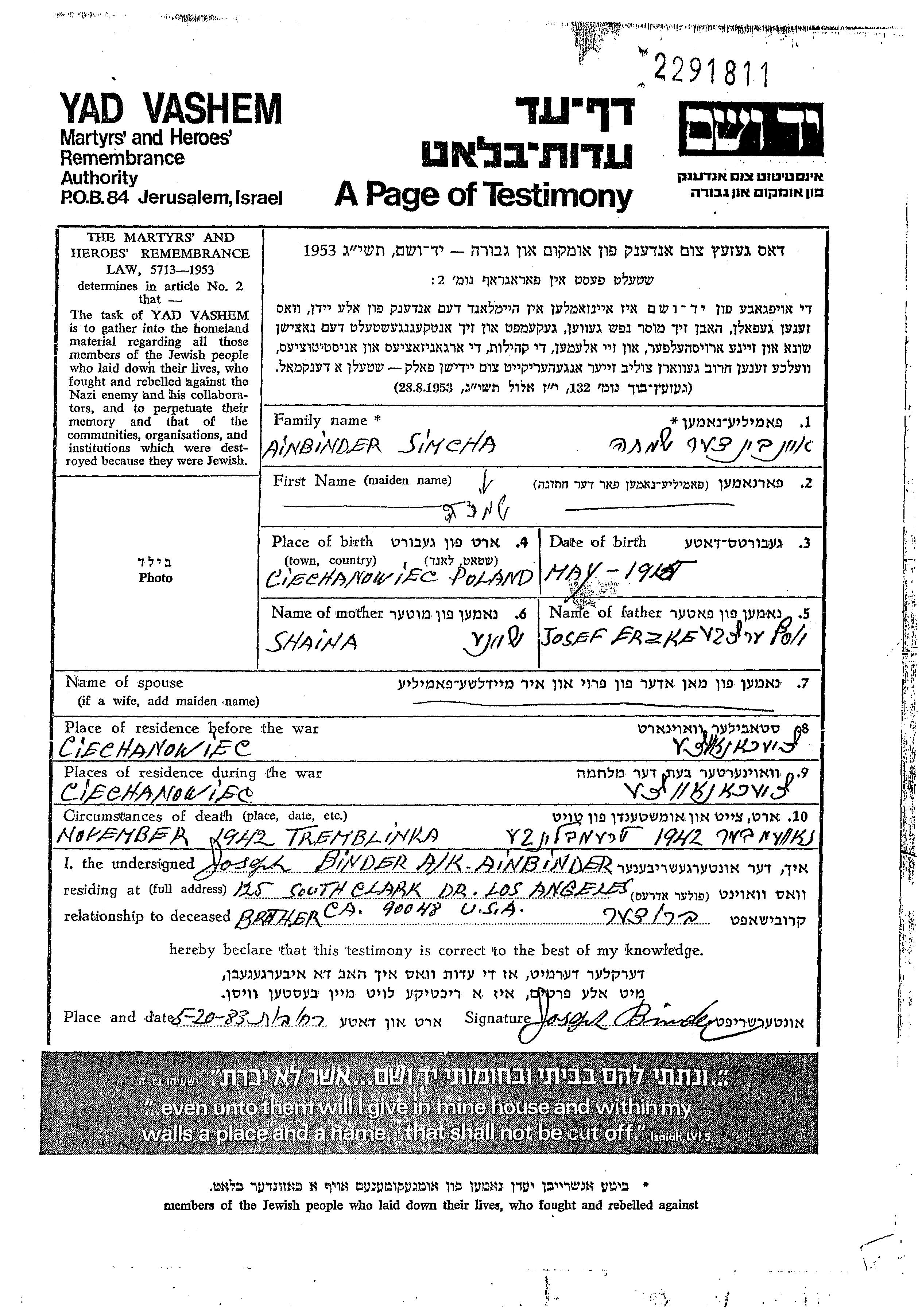 Ainbinder Simcha 1915 Ciechanowiec, Polonia Hoja de Testimonio