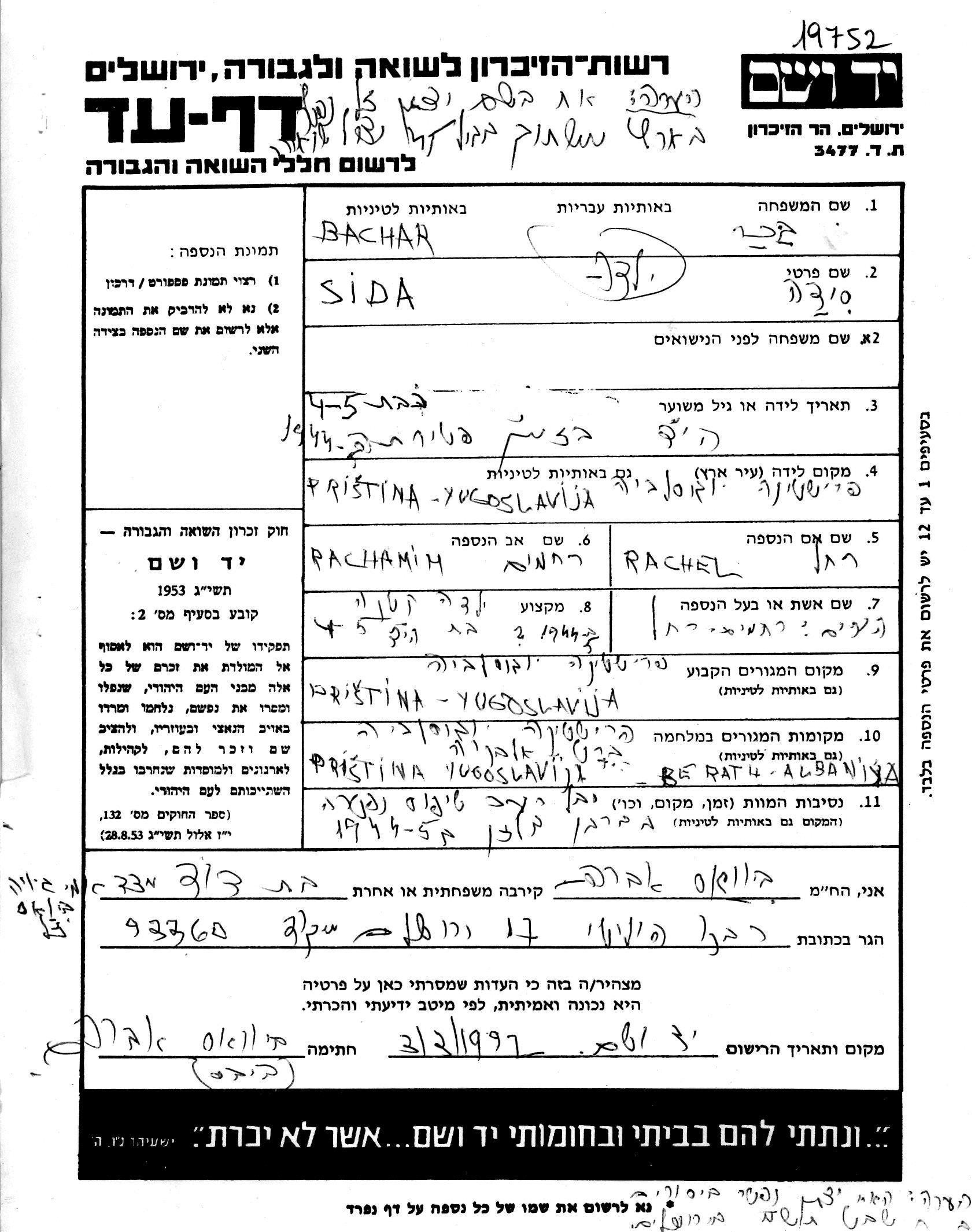 Bachar Bekher | Sida | Pristina, Yugoslavia | Hoja de Testimonio | |