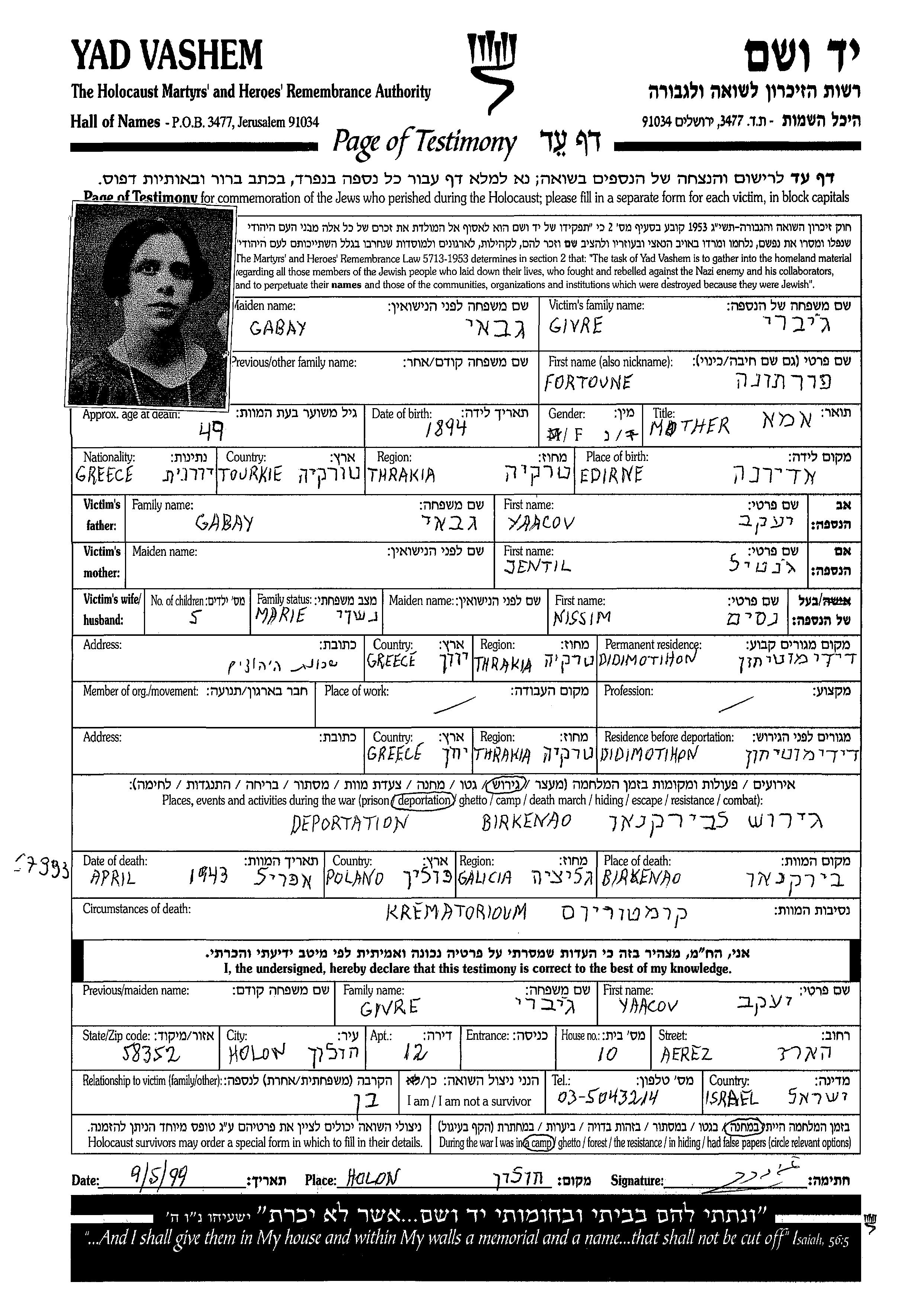 Fortoune Givre apellido de soltera Gabay nació en Edirne, Turquía en 1894. Antes de la segunda guerra mundial vivía en Didymotikhon, Grecia.