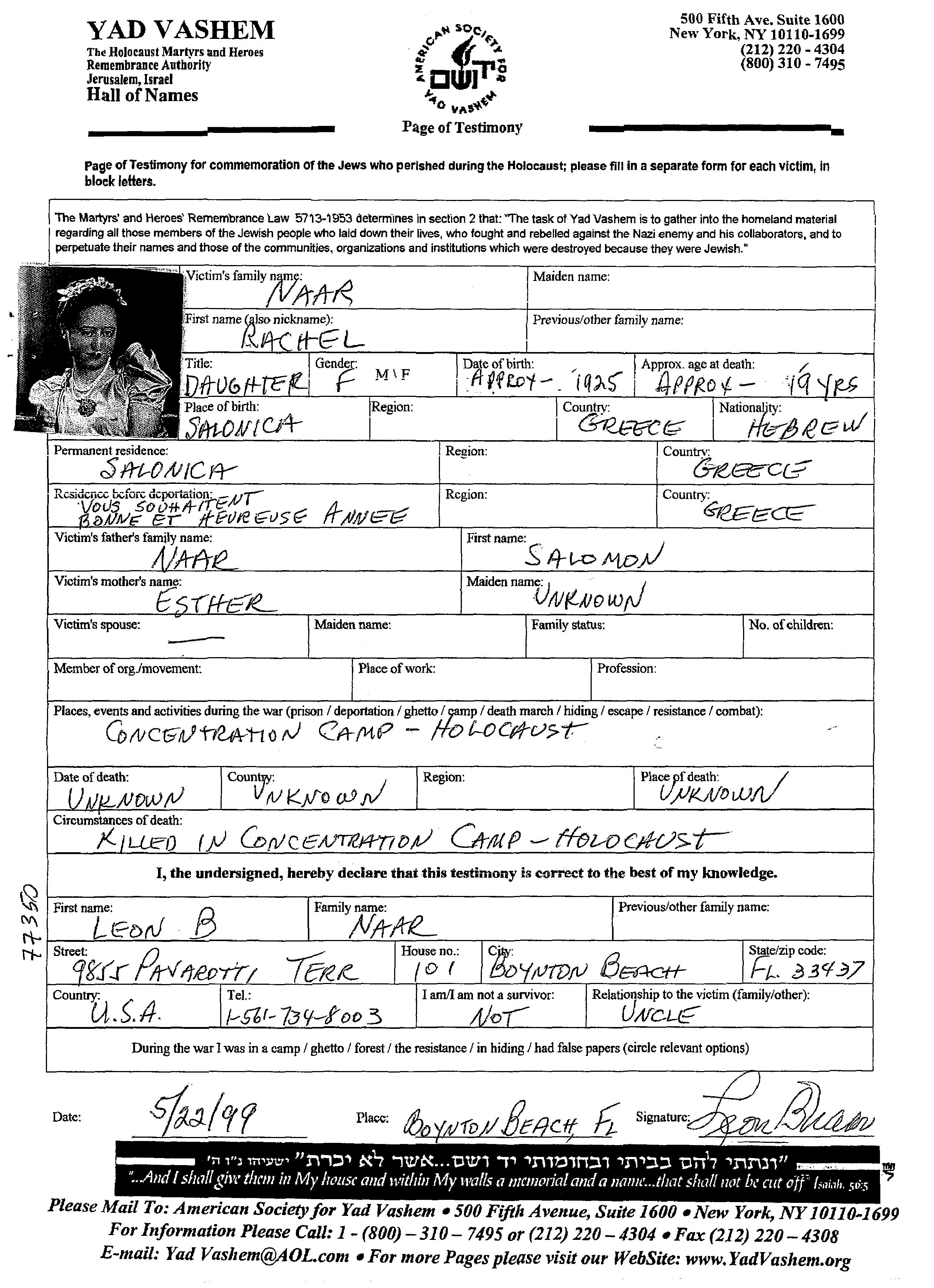 Rachel Naar nació en Thessaloniki, Grecia en 1925. Antes de la segunda guerra mundial vivía en Thessaloniki, Grecia.