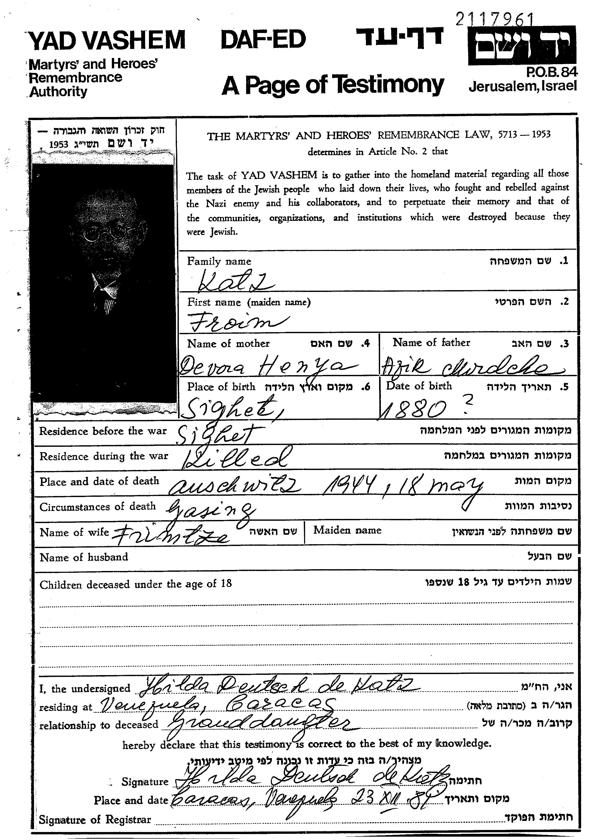 Froim Katz nació en Sighet, Rumania en 1880. Antes de la segunda guerra mundial vivía en Sighet, Rumania.