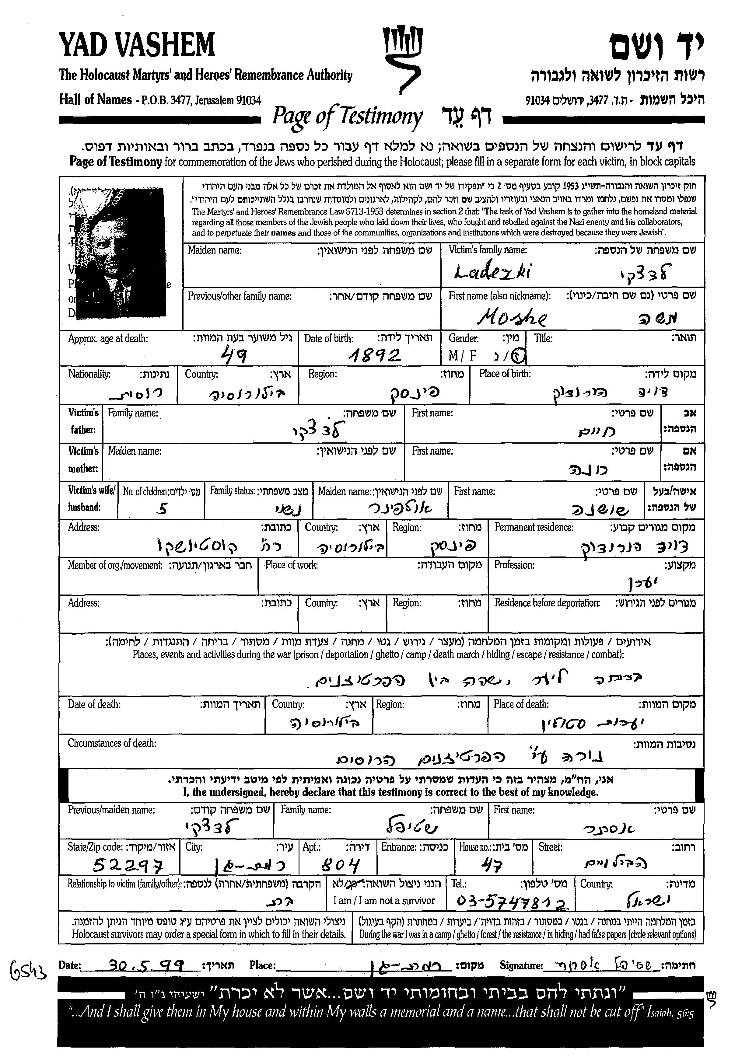 Ladezki | Moshe | 1892 | David Chorodjuk, Polonia | Hoja de Testimonio |