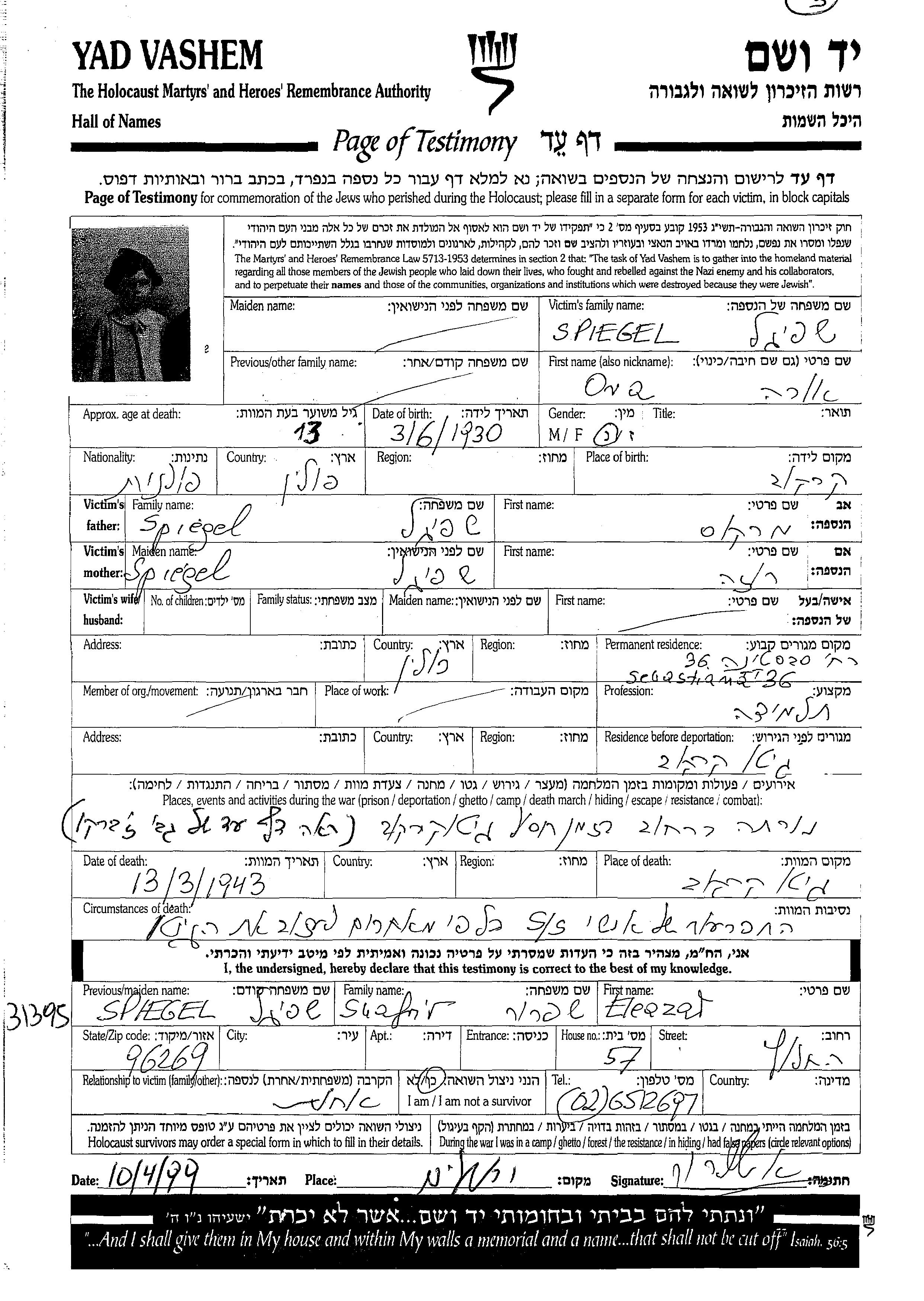 Ora Spiegel nació en Krakow, Polonia en 1930. Era Alumno/a. Antes de la segunda guerra mundial vivía en Krakow, Polonia.
