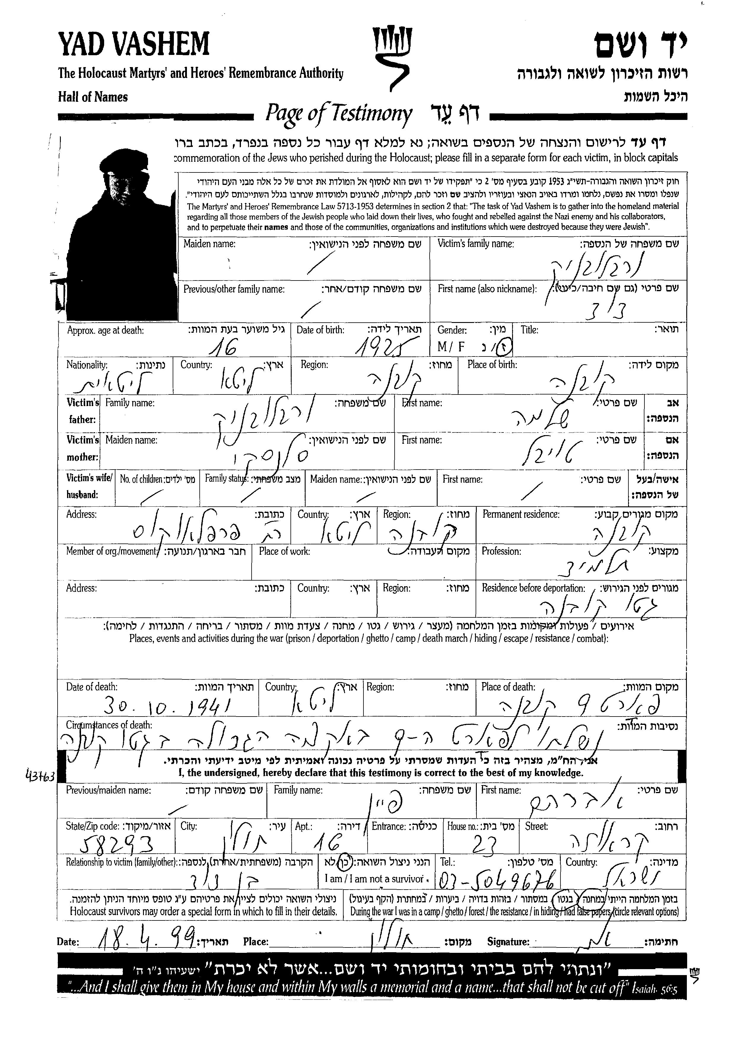 Yad Vashem - Colección conmemorativa de Hojas de Testimonio