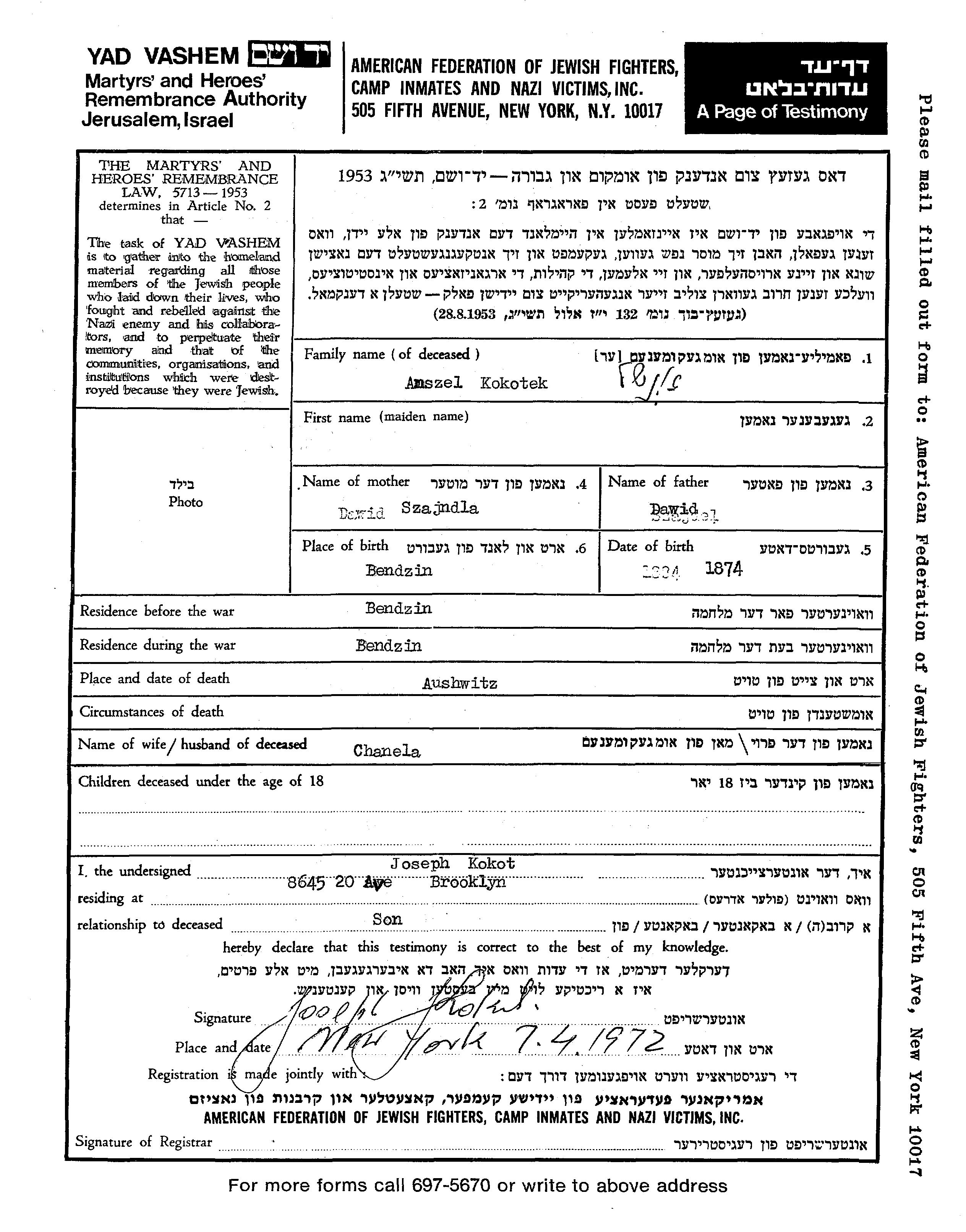 | Kokotek | Anshel | 1874 | Będzin, Polonia | Hoja de Testimonio |