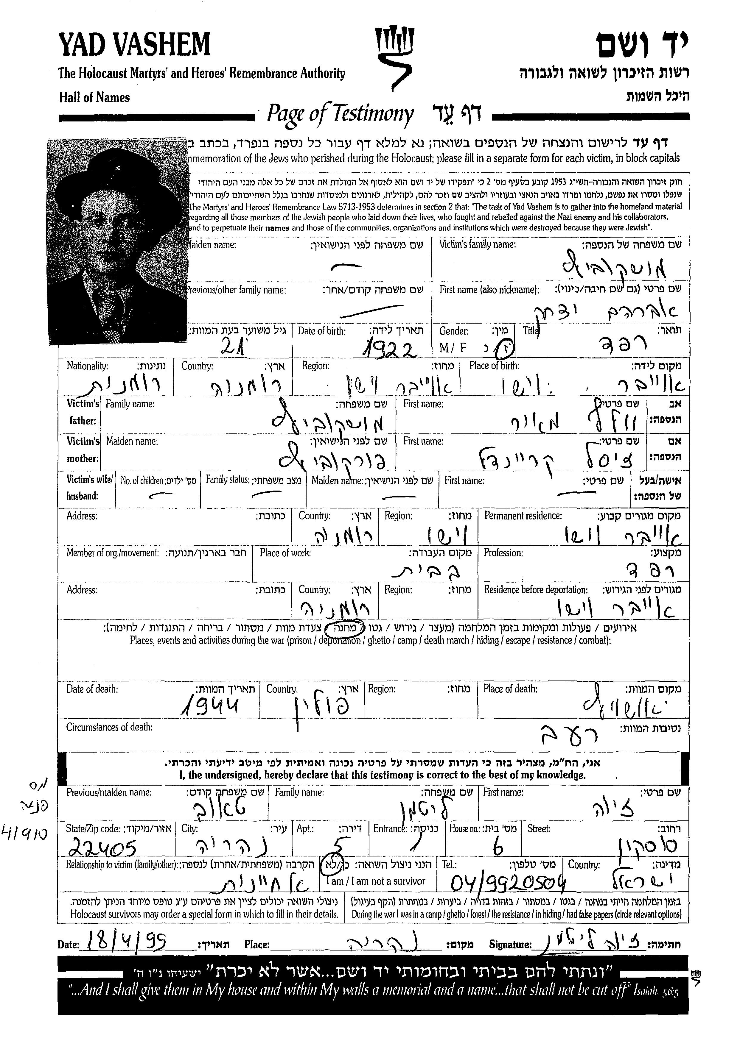 Yad Vashem - Colección conmemorativa de Hojas de Testimonio