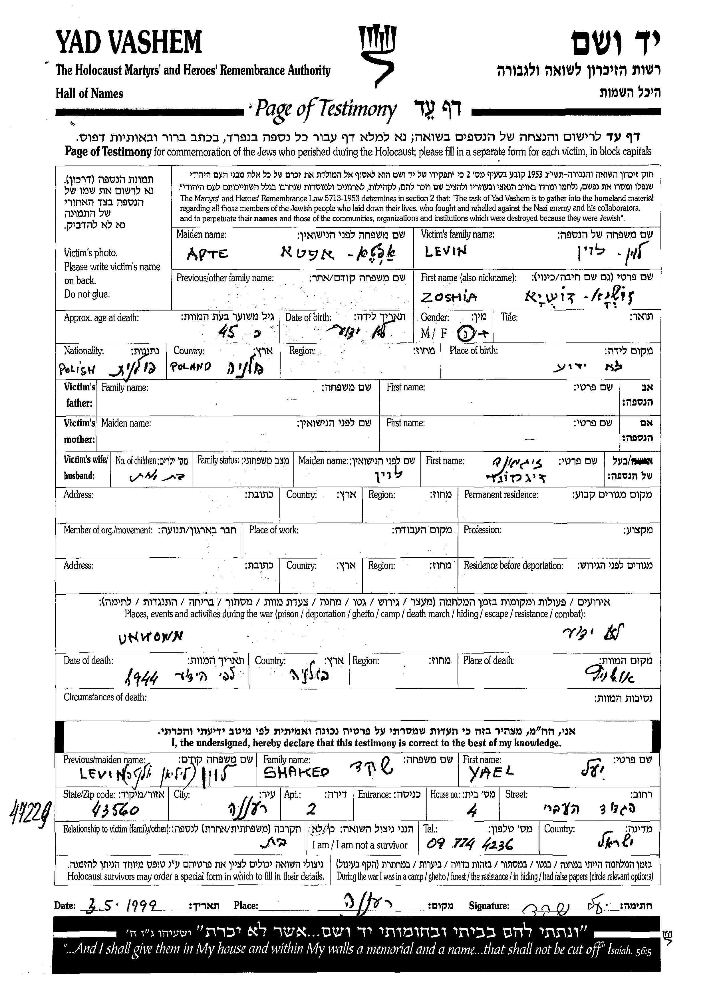 Yad Vashem - Colección conmemorativa de Hojas de Testimonio