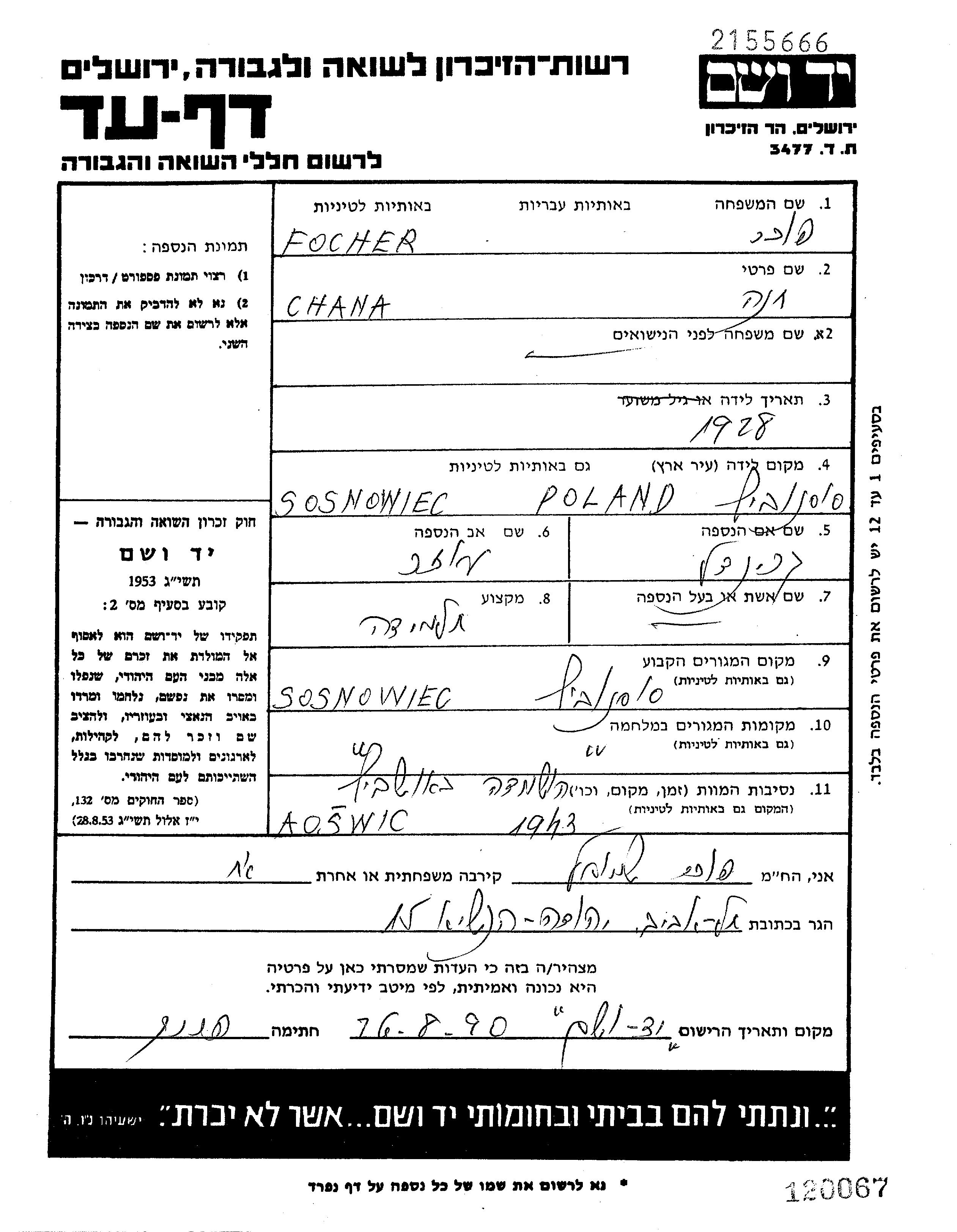 Focher Chana 1928 Sosnowiec, Polonia Hoja de Testimonio