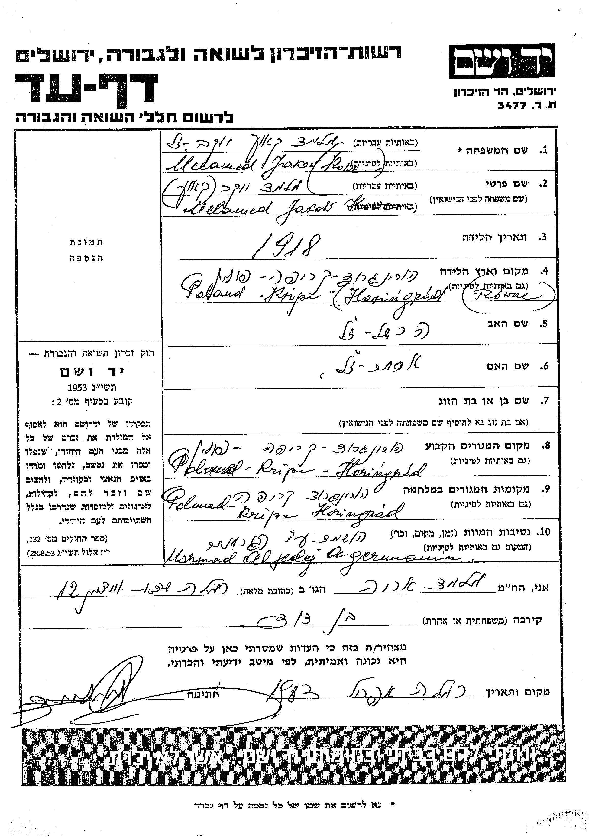 Melamed Jakow 1918 Kripa, Polonia Hoja de Testimonio