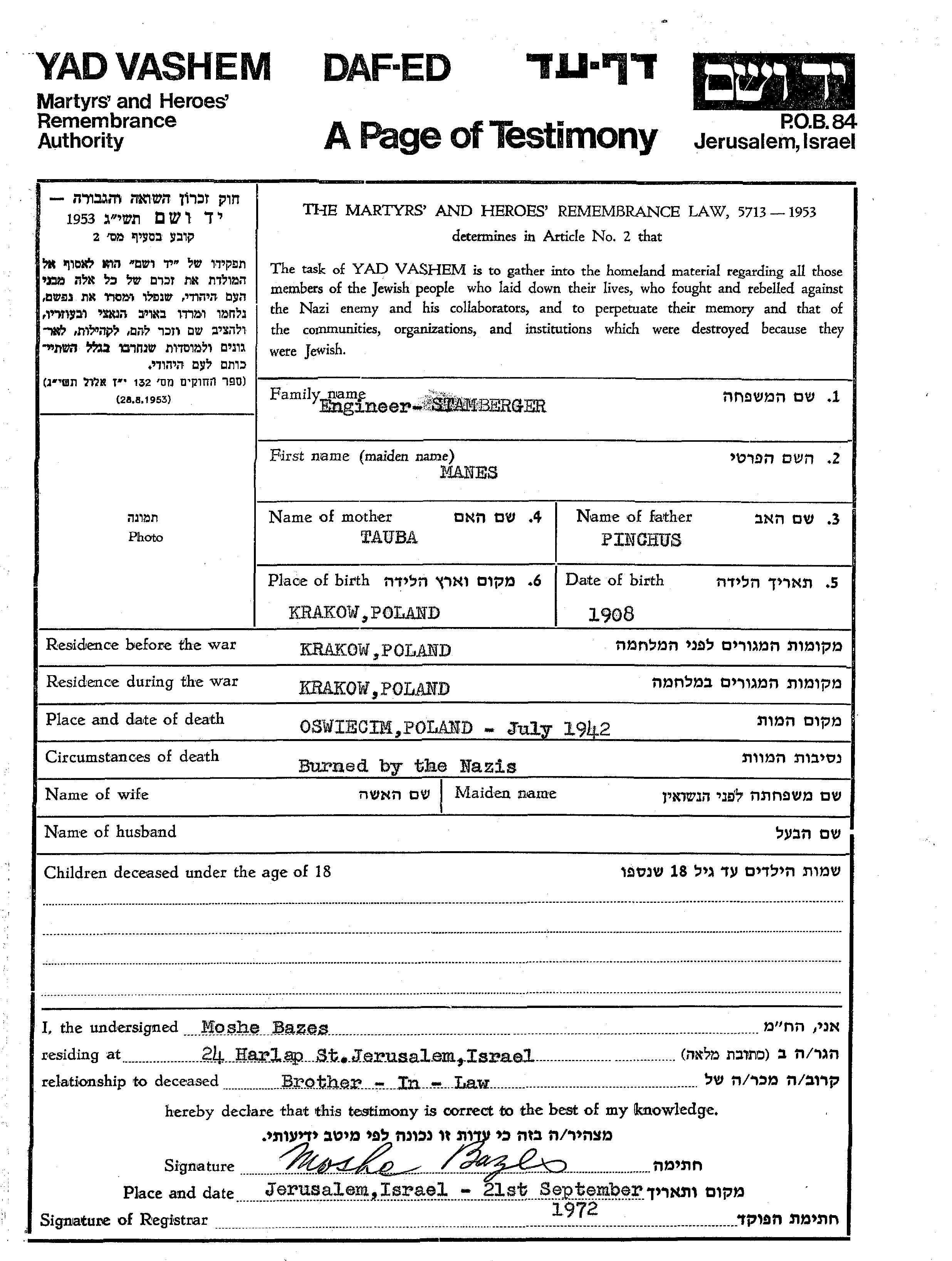 Ingeniero Manes Stamberger nació en Krakow, Polonia en 1908, hijo de Pinchus y Tauba. Antes de la segunda guerra mundial vivía en Krakow, Polonia. Durante la guerra estuvo en Krakow, Polonia.