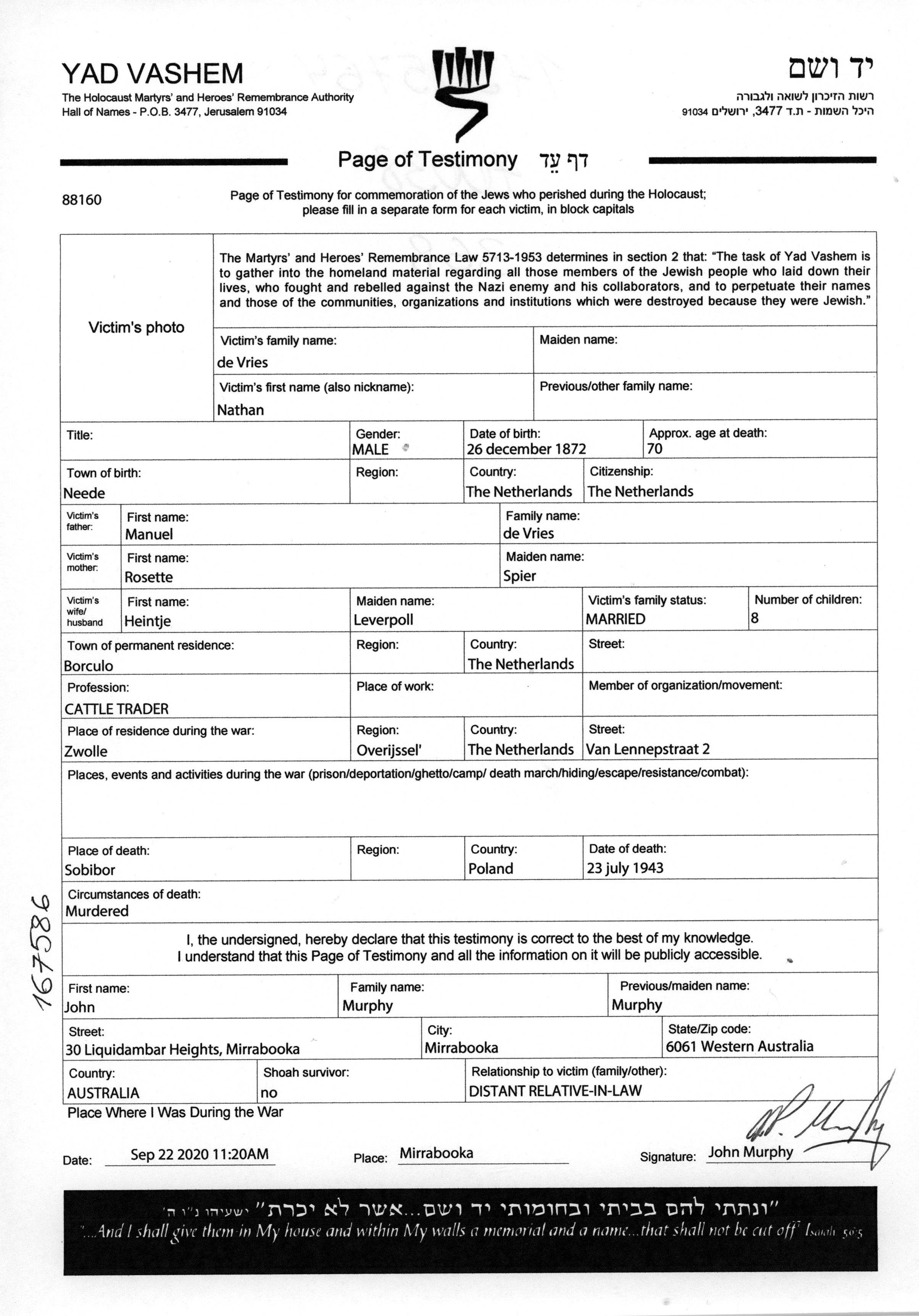 | de Vries | Nathan | 1872 | Borculo, Holanda | Hoja de Testimonio (digital firmada) |