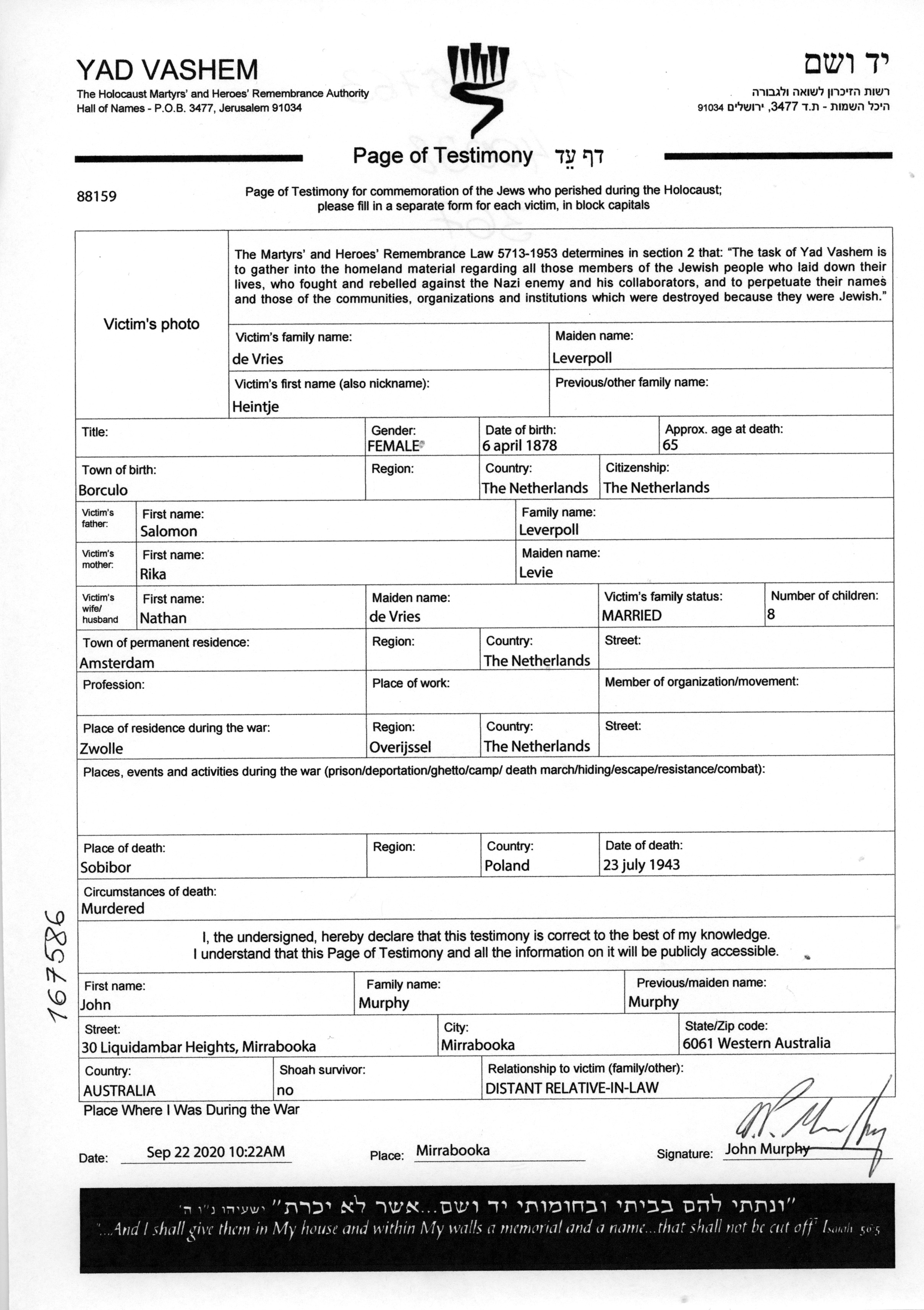 | de Vries | Heintje | 1878 | Amsterdam, Holanda | Hoja de Testimonio (digital firmada) |